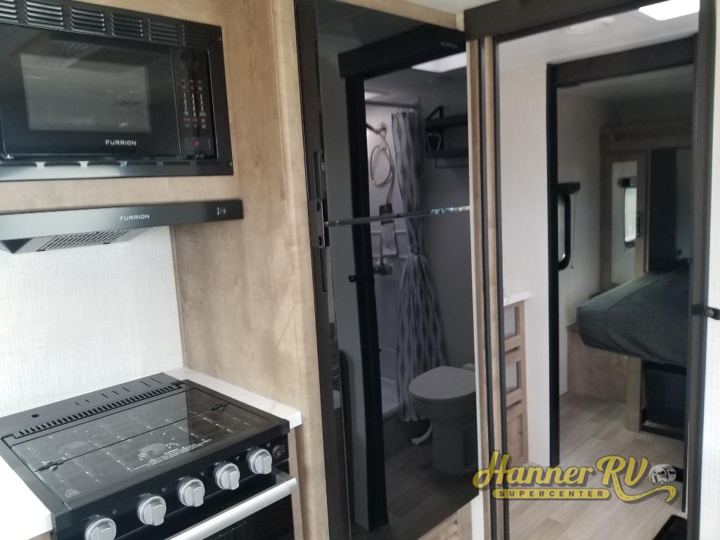 Comfort comes easy in this dual entry travel trailer! You can enter in through the front master bedroom with an Olympic RV queen bed or the rear living area with a sofa. There are also two end tables on either side of the sofa plus a spacious pantry for snacks and dry goods. A three-burner cooktop and air fryer microwave will let you make meals each day, and a booth dinette provides a place to dine together. And don't overlook the walk-through bath that is easily accessible from the bedroom or kitchen!