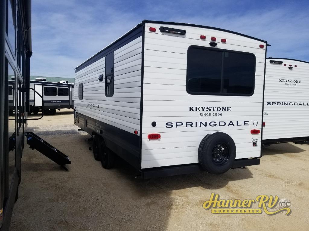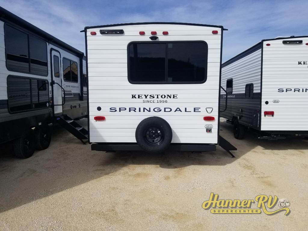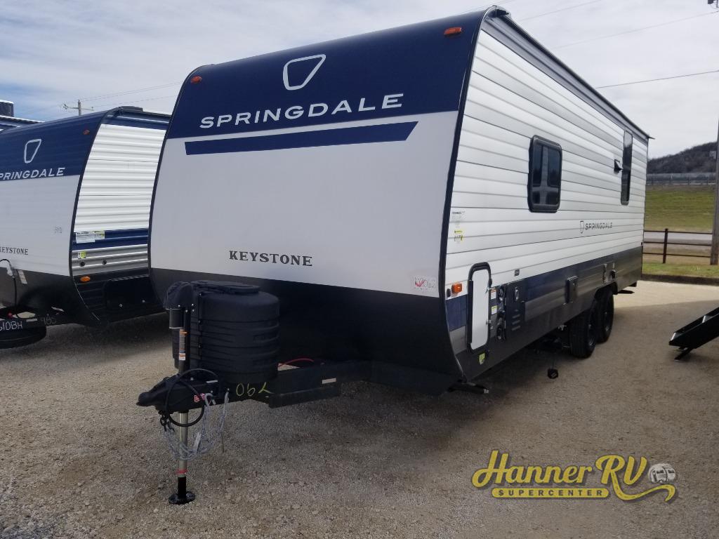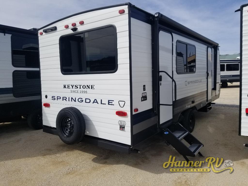 The Springdale travel trailers by Keystone will provide you and your family many great outdoor experiences and at-home comforts. Each one is constructed with a AlphaPly TPO roof membrane, Solid Step entry steps and XL tinted safety glass windows. There are also heavy-duty stabilizer jacks, along with an outside shower, a power awning with LED lights, and each model is SolarFlex ready if you choose to add solar power. Inside, you'll find blackout night shades, pressed membrane premium countertops, a stainless-steel sink, and LED lighting to keep your space well lit.