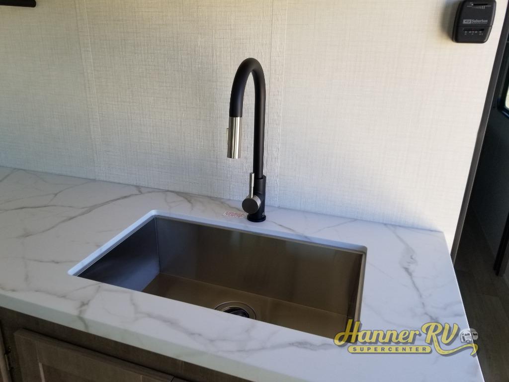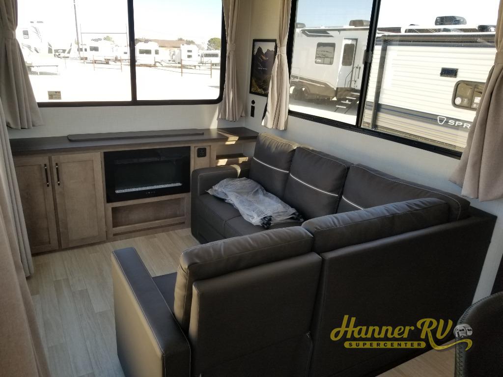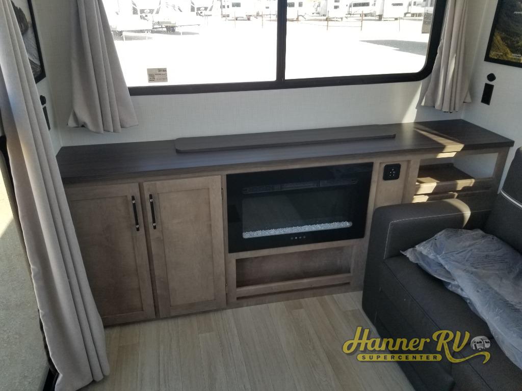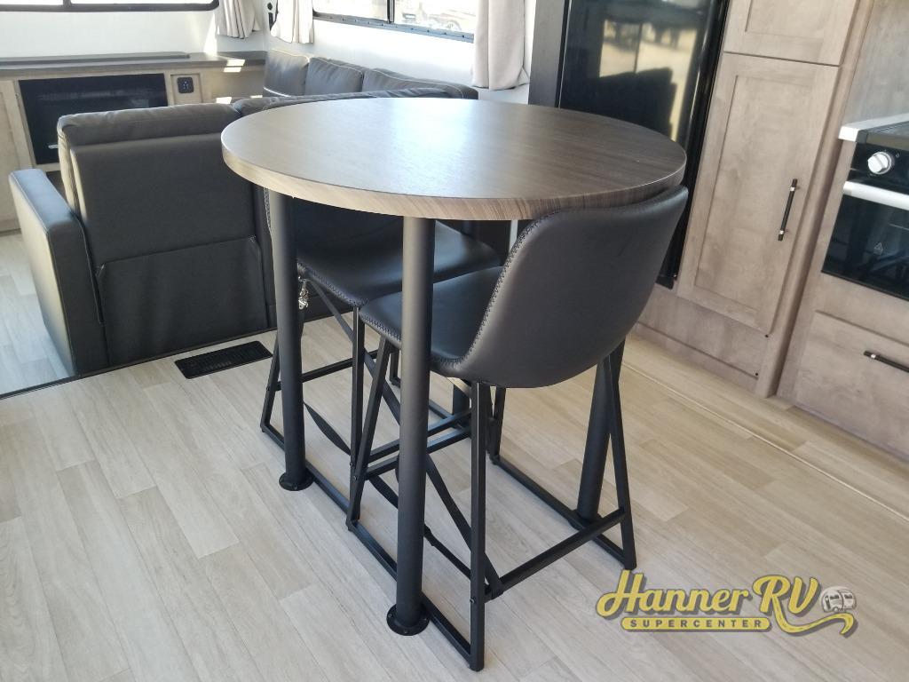 This travel trailer is designed for campers who want residential-style comfort without giving up easy towing, offering a smart and functional layout for everyday living on the road. A sunken living room creates a cozy, separate lounge space, complete with a fireplace and a large sectional sofa that’s perfect for stretching out or hosting friends. In the kitchen area, a bistro table gives you a stylish spot for coffee, meals, or laptops without eating up floor space. At the end of the day, you can retreat to the front bedroom where an Olympic RV queen bed and dual wardrobes provide extra sleeping room and plenty of storage so you can stay organized on every trip.