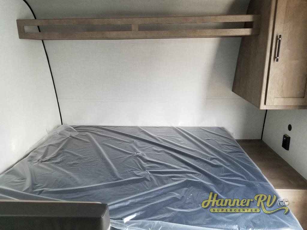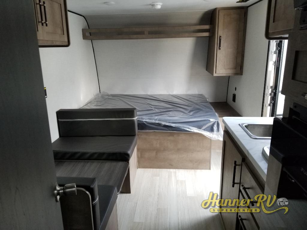 This travel trailer with rear corner bunk beds is sure to be a hit at the campground! While your guests or little ones take the bunks, you can enjoy the front Olympic RV queen bed to yourselves. There is even storage under the bed, an overhead shelf, and a wardrobe for your things. The chef of your group can whip up meals on the two-burner cooktop or in the microwave oven, and there is a 3.3 cu. ft. 12V refrigerator to keep food fresh. A booth dinette provides a place to dine together, or you can take your plate outdoors to sit under the 8' power awning with LED lights!
