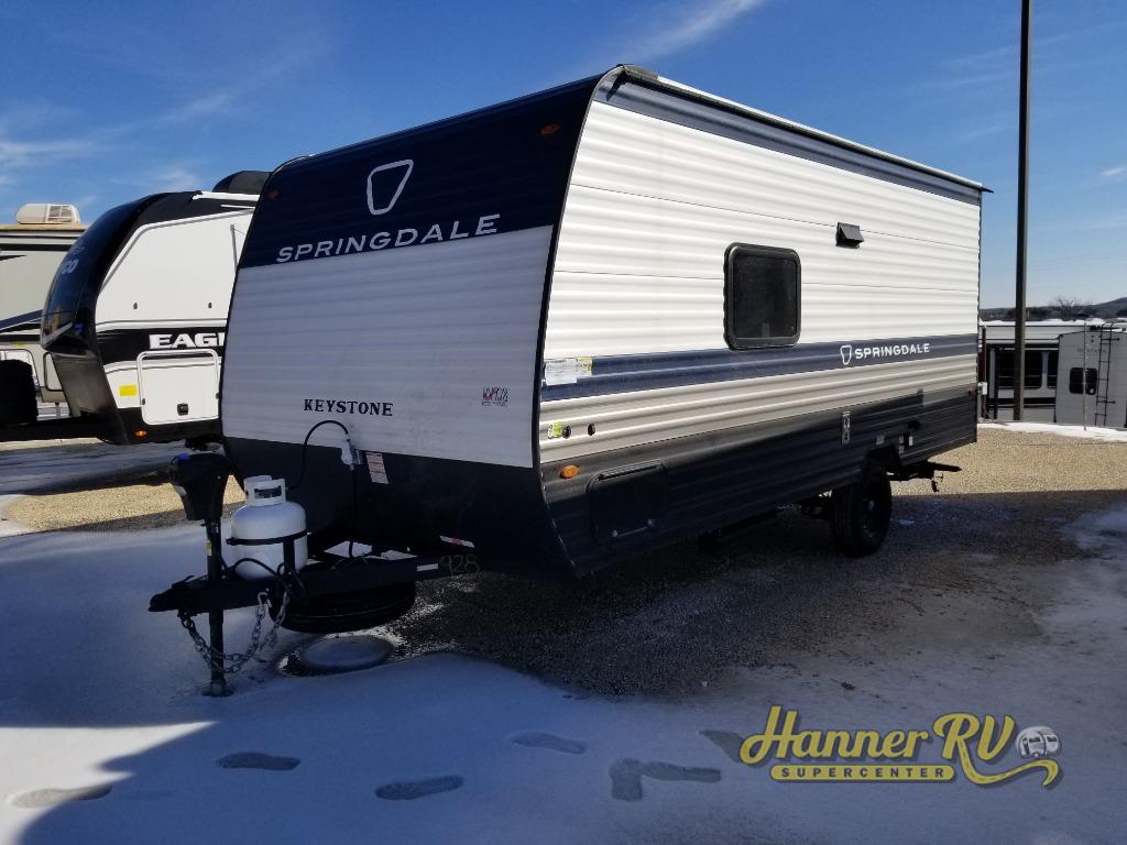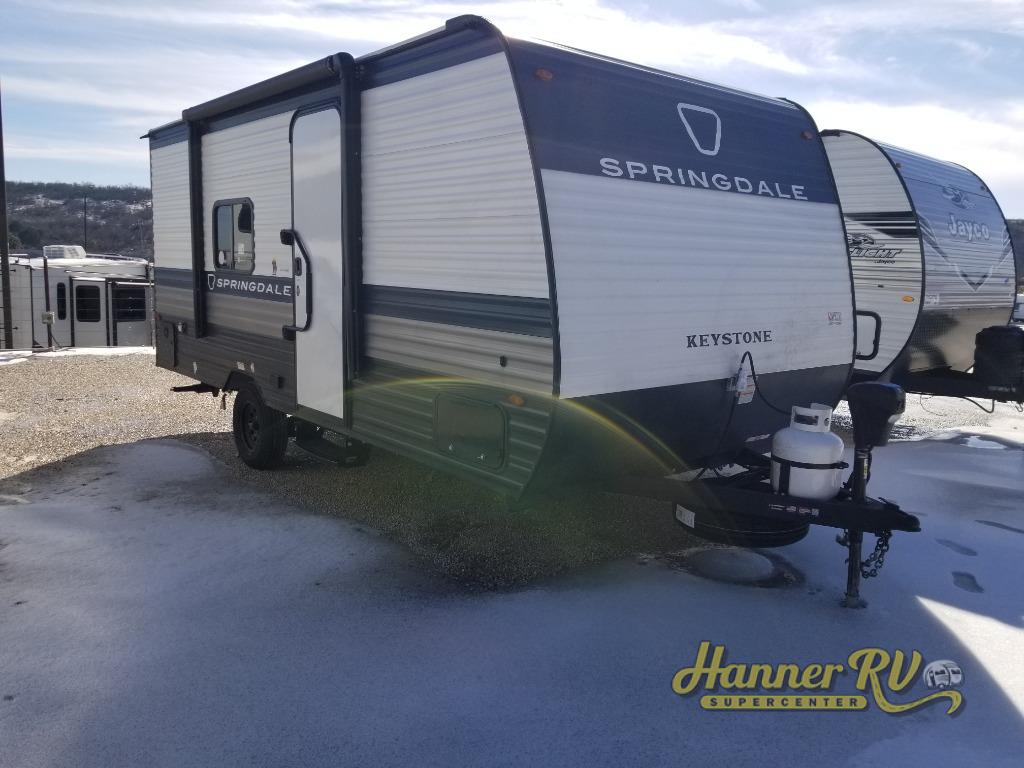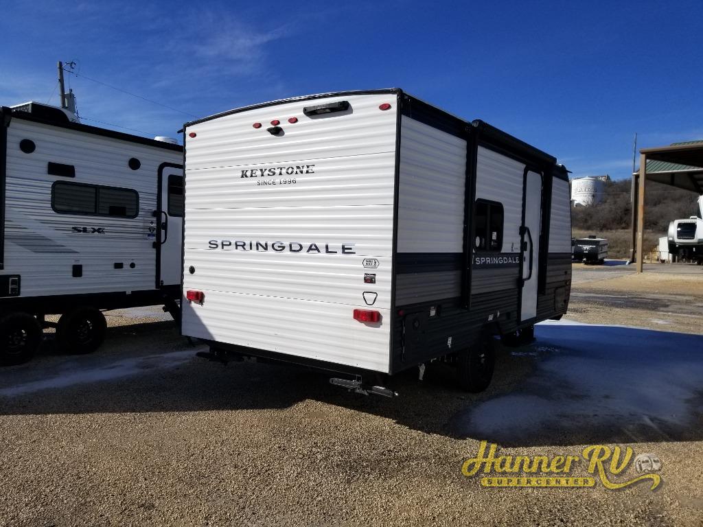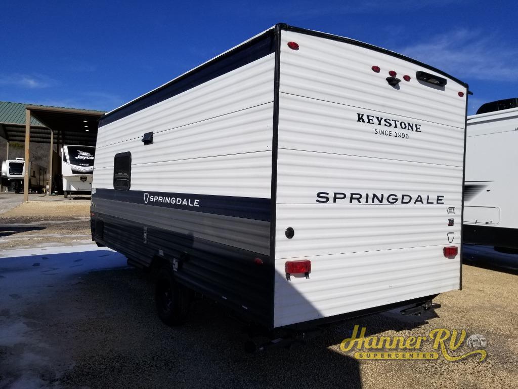 With any Springdale Mini travel trailer by Keystone, you will enjoy lightweight towing thanks to their single axle! The XL tinted safety glass windows are ultra durable, and the power awning will provide protection from the sun as you relax in your camp chairs outside. Each model includes blackout night shades, LED lighting, plus many more interior comforts. There is also a 20K BTU furnace to keep you comfortable, plus a tankless water heater for endless hot showers!
