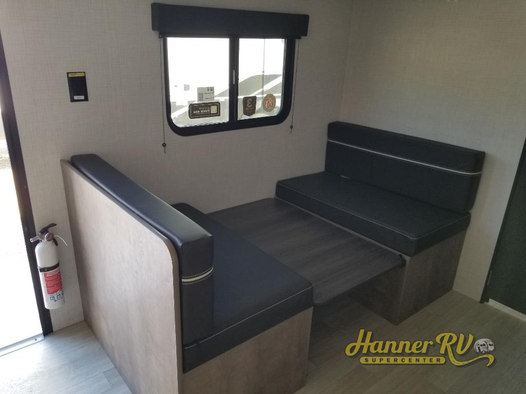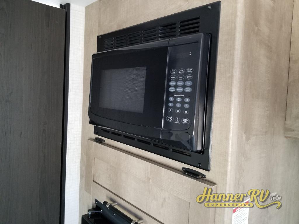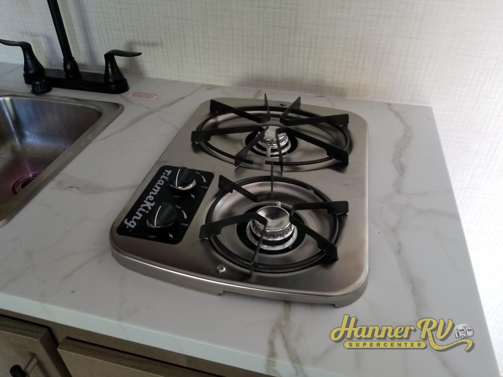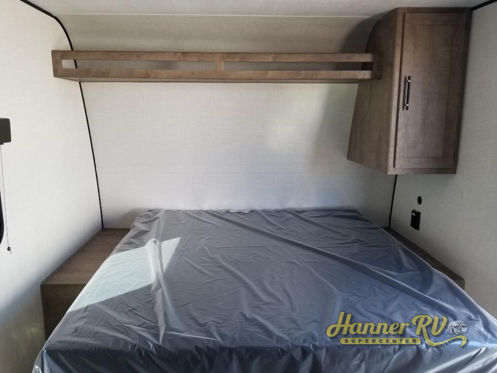Camping trips just got easier travel trailer that can sleep three to four each night! There is a front Olympic RV queen bed with an overhead shelf and bedside wardrobe for your things. A two-burner cooktop and microwave oven will let you make breakfast for your crew, and a booth dinette provides a place to dine together, as well as convert to sleeping space for a guest or two little ones. This travel trailer also includes a full rear bath, complete with a shower, toilet, and vanity with a sink and overhead cabinet!
