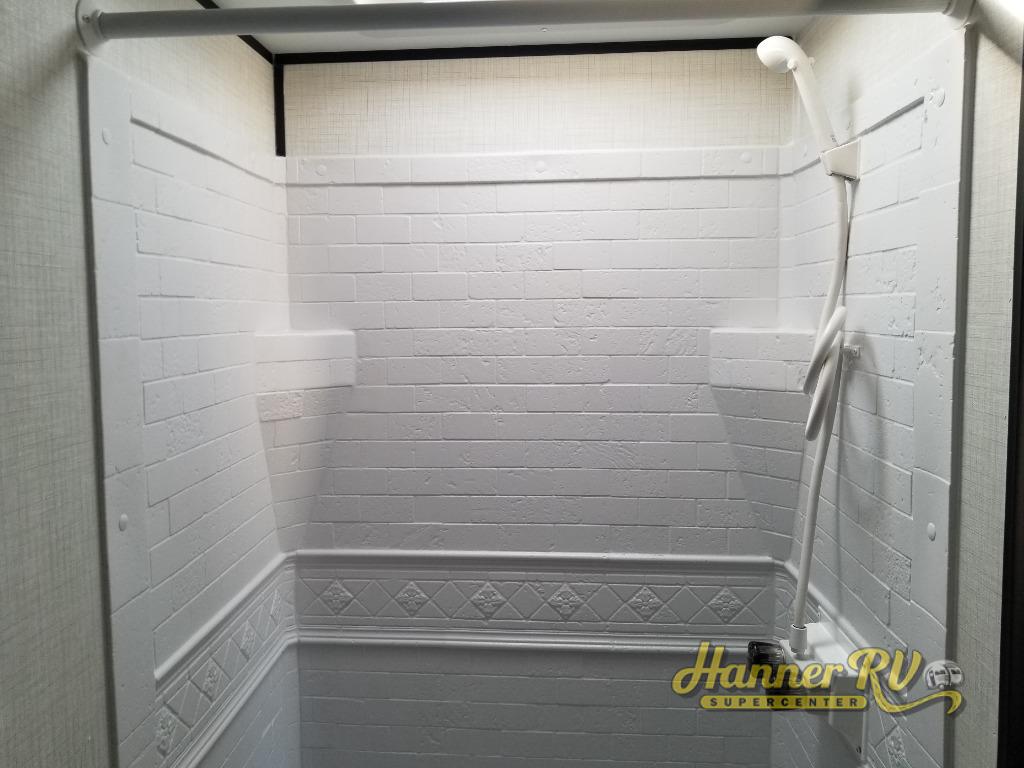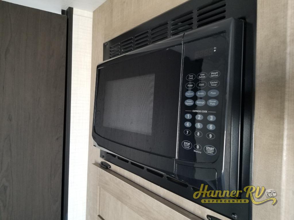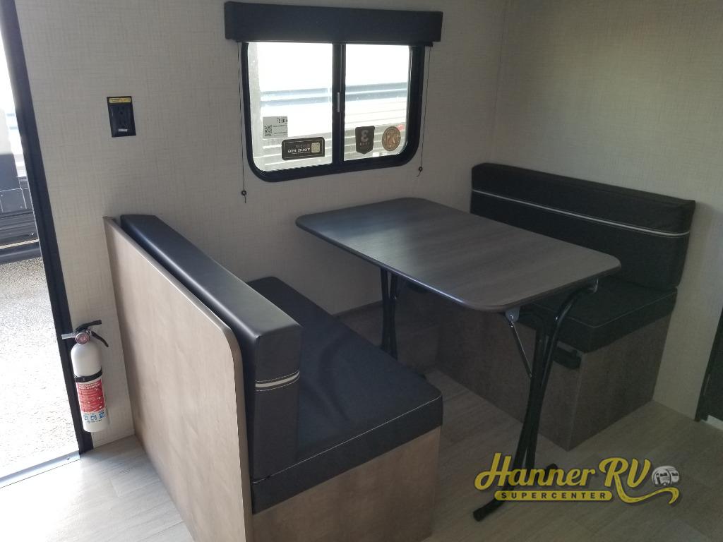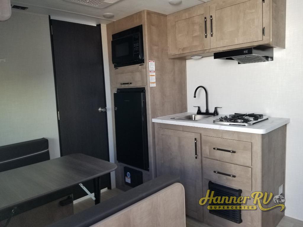 Camping trips just got easier travel trailer that can sleep three to four each night! There is a front Olympic RV queen bed with an overhead shelf and bedside wardrobe for your things. A two-burner cooktop and microwave oven will let you make breakfast for your crew, and a booth dinette provides a place to dine together, as well as convert to sleeping space for a guest or two little ones. This travel trailer also includes a full rear bath, complete with a shower, toilet, and vanity with a sink and overhead cabinet!
