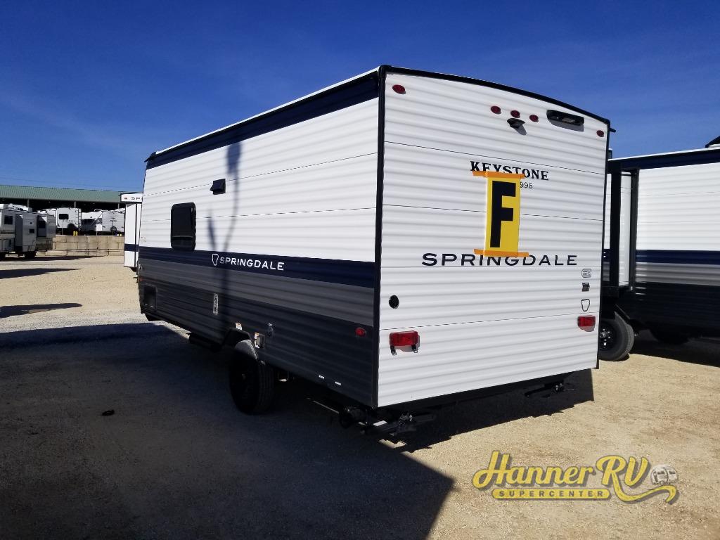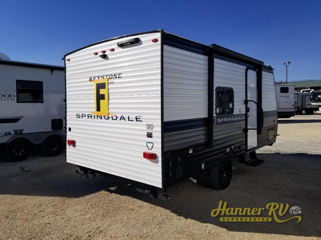 With any Springdale Mini travel trailer by Keystone, you will enjoy lightweight towing thanks to their single axle! The XL tinted safety glass windows are ultra durable, and the power awning will provide protection from the sun as you relax in your camp chairs outside. Each model includes blackout night shades, LED lighting, plus many more interior comforts. There is also a 20K BTU furnace to keep you comfortable, plus a tankless water heater for endless hot showers!