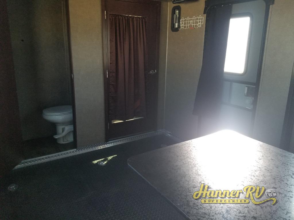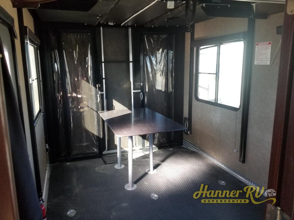 Get started with 12' of garage space including a rear ramp door for ease of loading and unloading. There is also a side man door into the cargo area if you need to check on things while on the move or after the rear ramp door is closed. There is also an additional loft space in the front of the cargo area and a convenience half bath too. A ladder to the loft can be found just inside the main living area door.