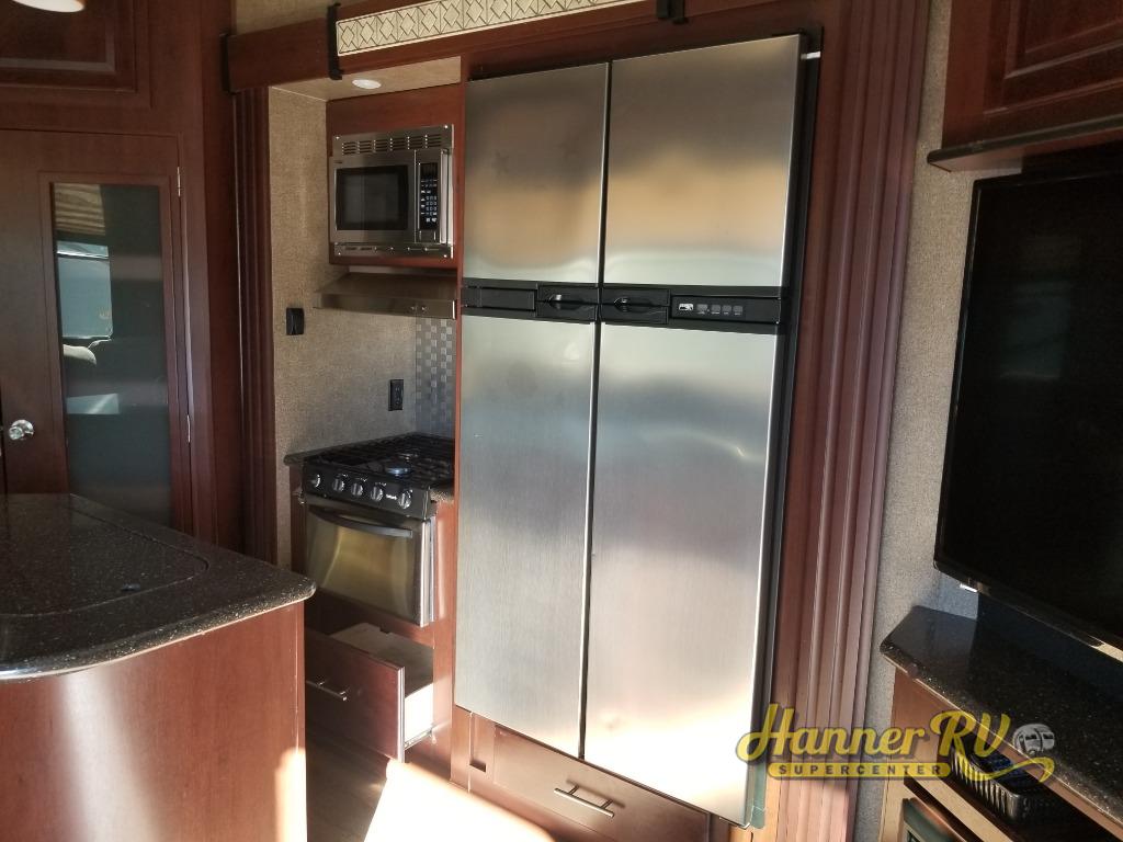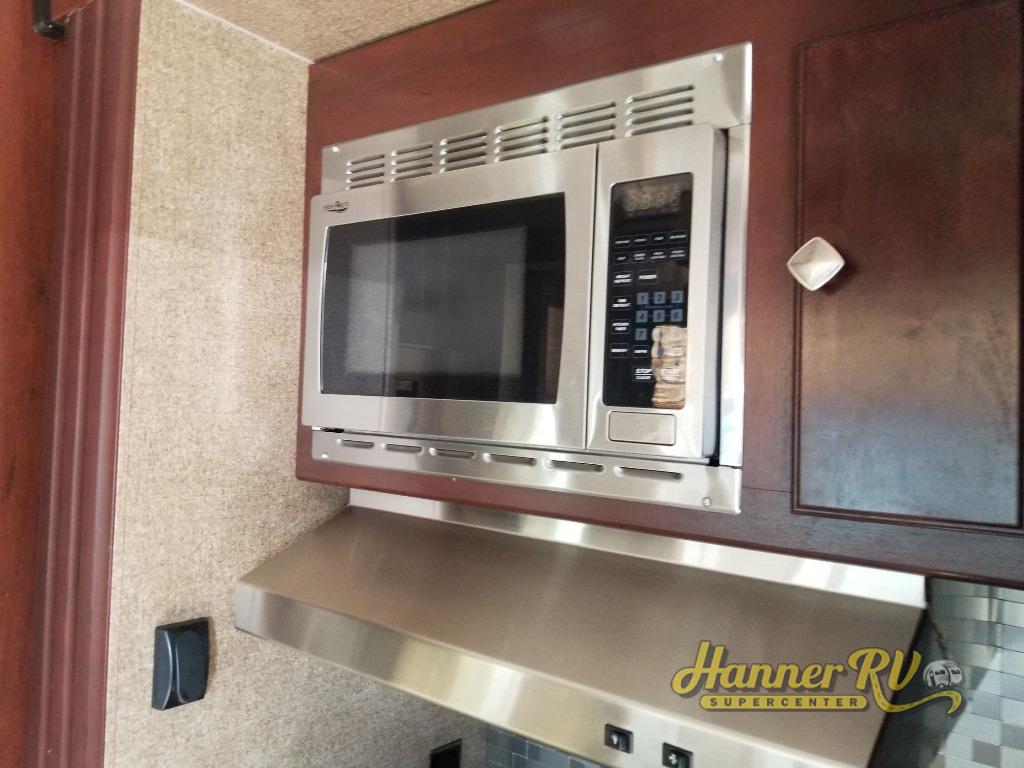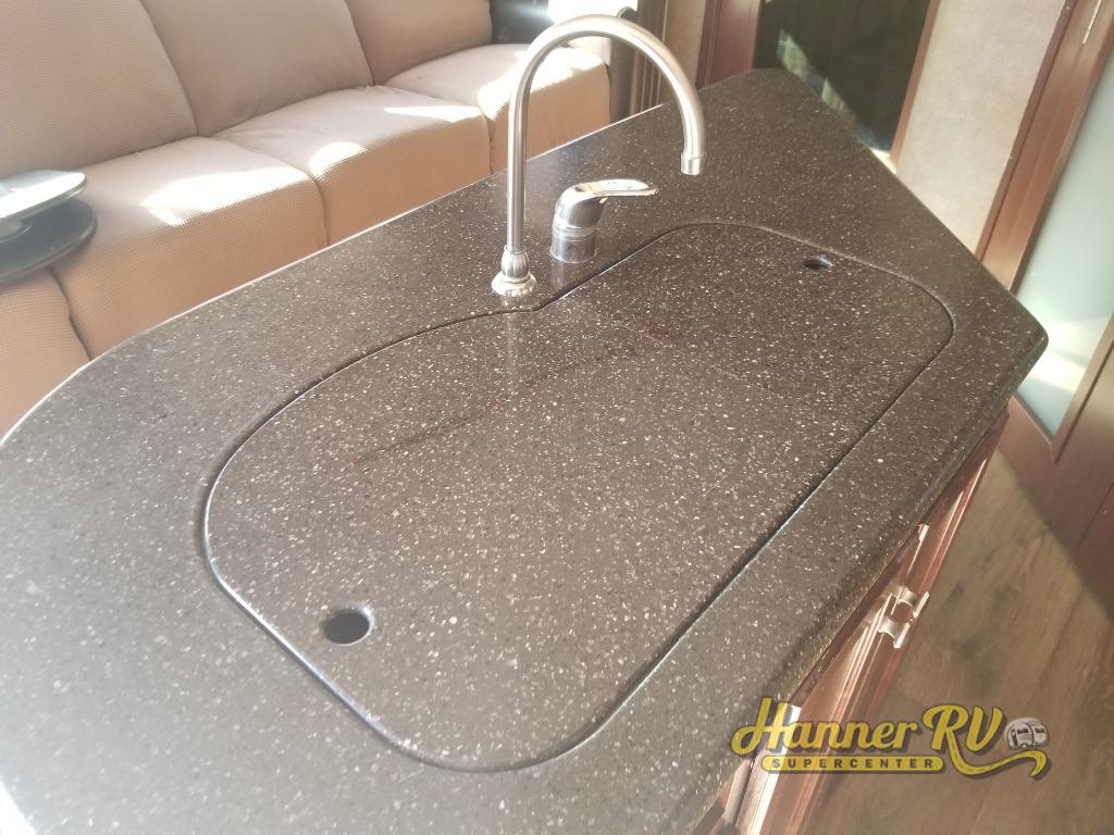 Inside the 425 combined living and kitchen area you will find a spacious retreat. A large sofa with two dining tables will provide plenty of seating for meal time or game time along the curb side wall. There is a center island bar that features a double kitchen sink. Behind the island is a slide out three burner range, plus a refrigerator and pantry for all of your cooking and food prep needs.