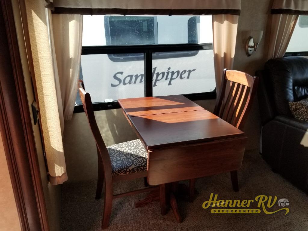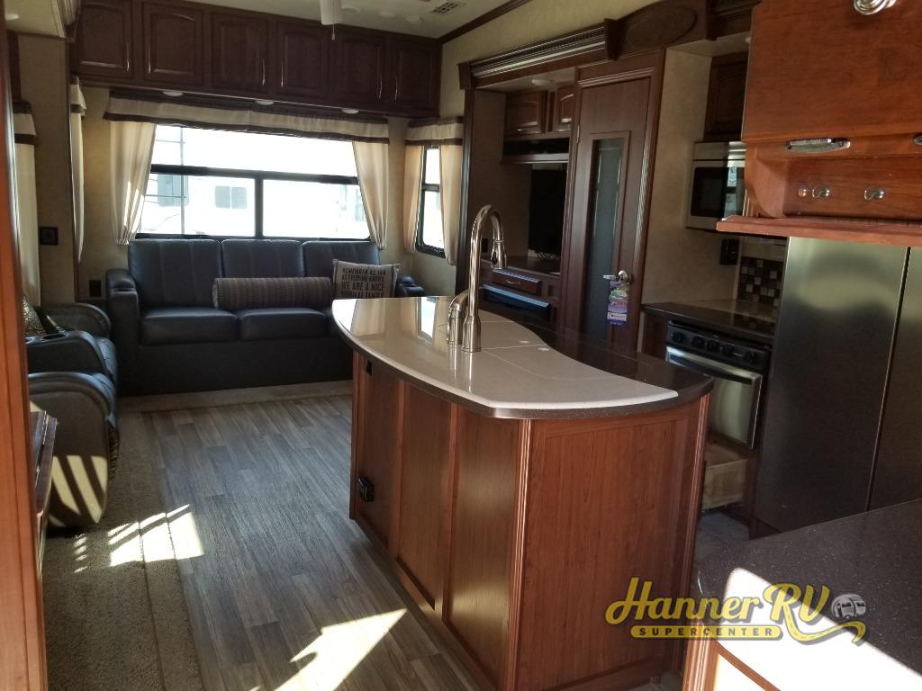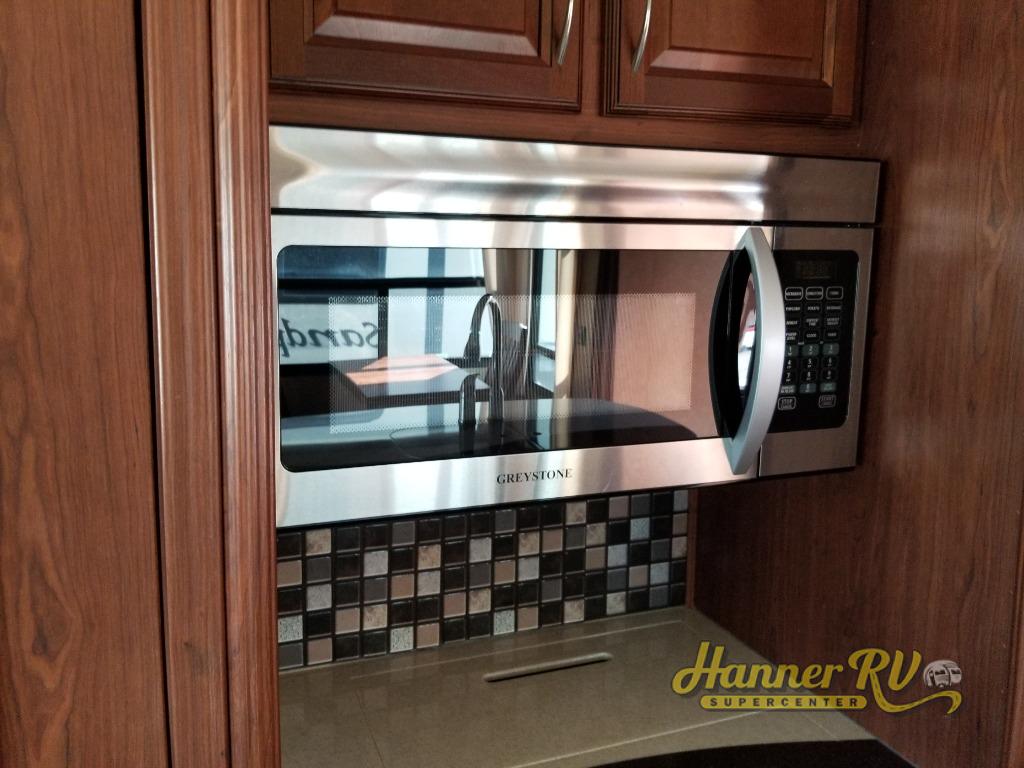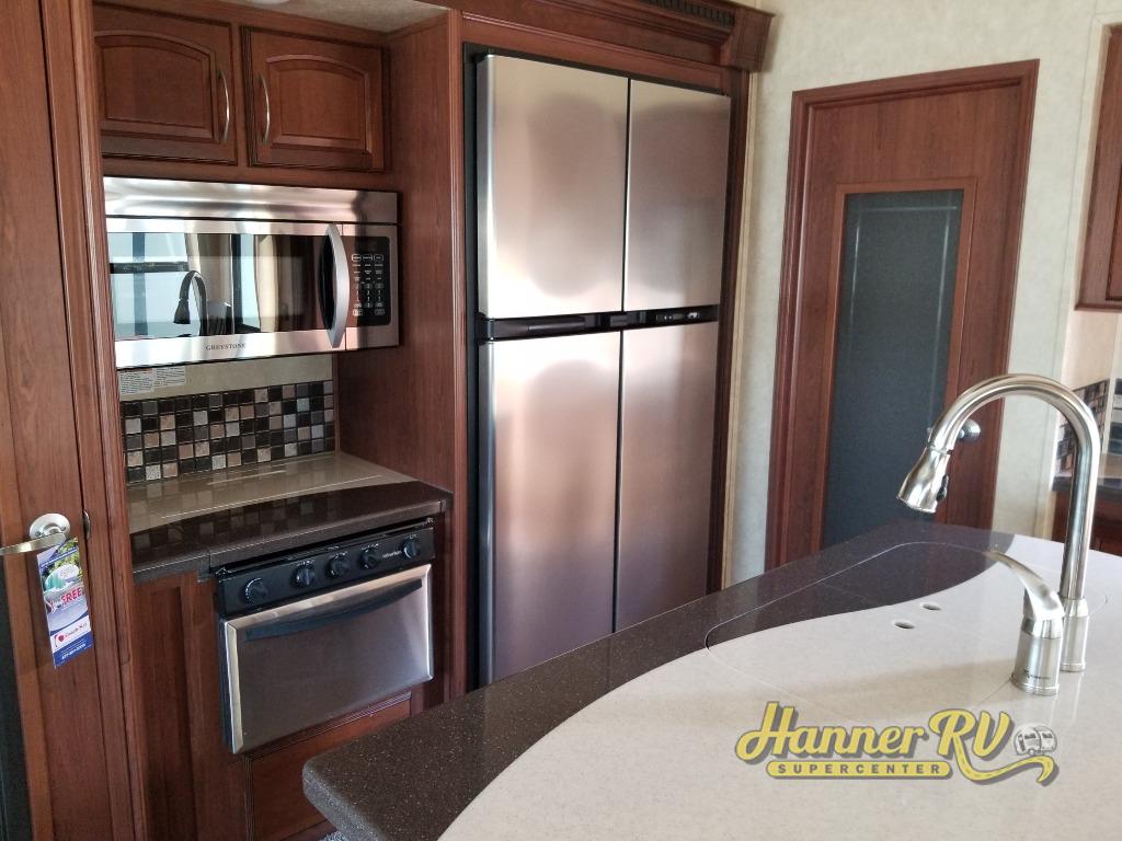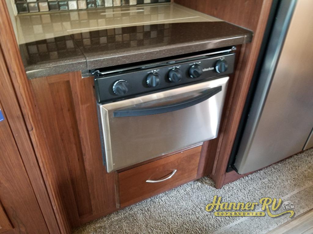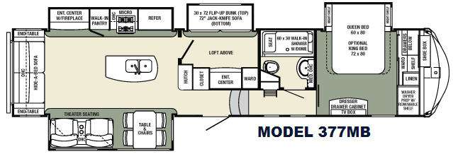 Back down to the main entry door find a closet opposite the door along side of a storage hutch. There is a slide out dining table with four chairs, and theater seating for two with overhead cabinets. Along the rear wall enjoy a comfortable sofa with overhead cabinets and end tables. Here you can relax and enjoy the entertainment center found in the adjacent slide out along the road side that also features the kitchen appliances as well.