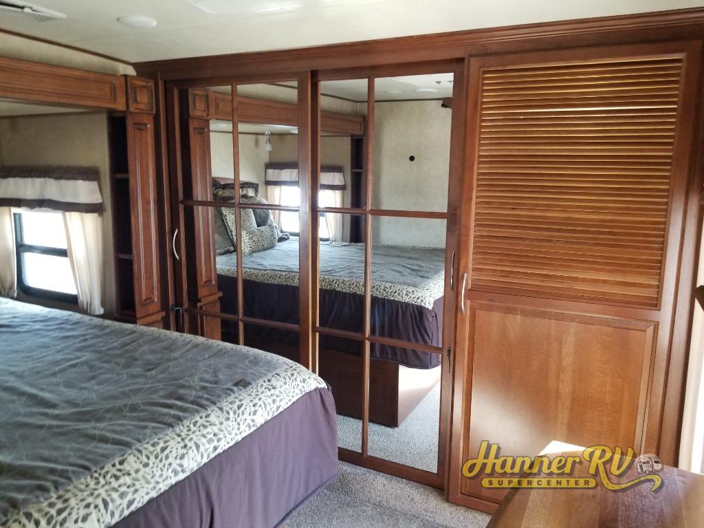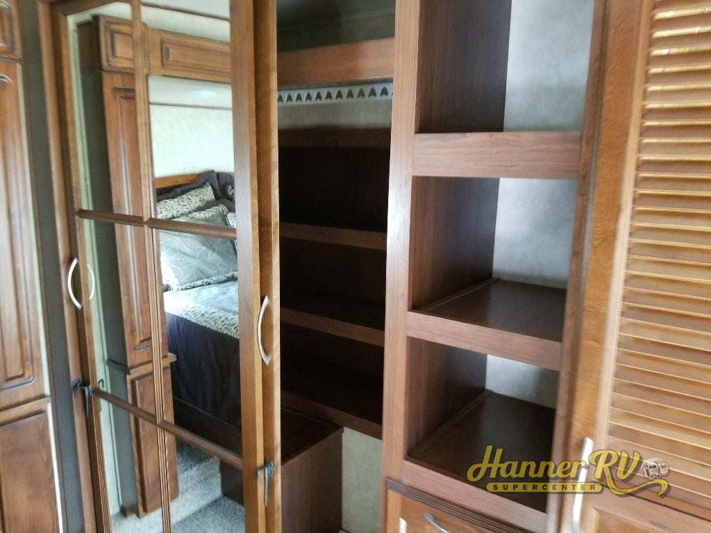 The front master bedroom is at the head of the hall and offers a spacious retreat including a queen slide out bed with a night shelf on either side, a dresser with TV box above opposite, and a front wall closet with linen storage, shoe storage, drawers, and a shelf.