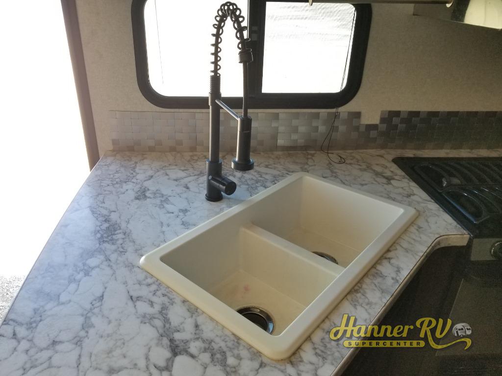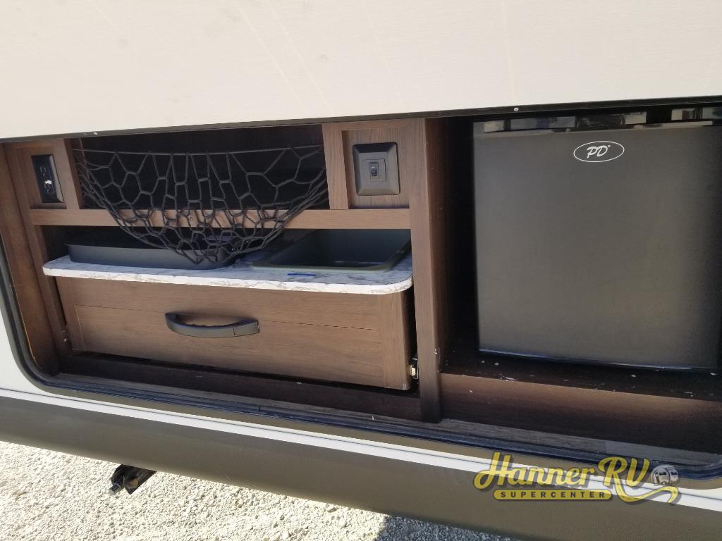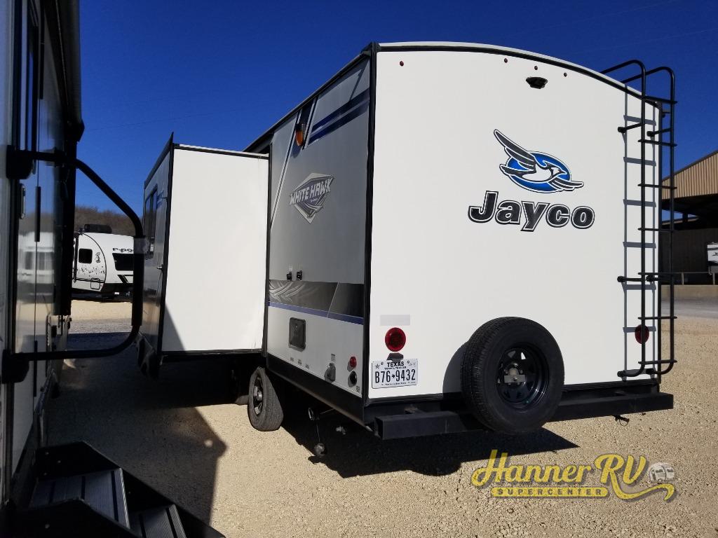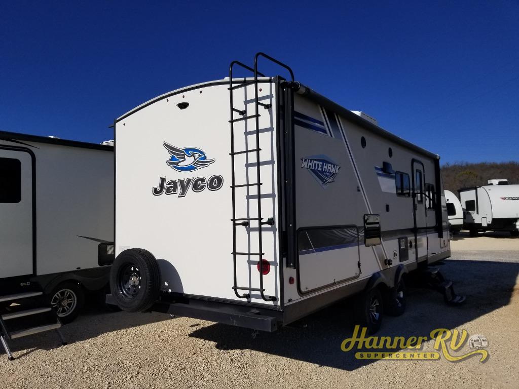 This White Hawk travel trailer is a wonderful addition to any family who is looking for an RV that delivers style and reliability. The residential appliances allow you to cook and store dinner with ease, and in this unit, you aren't restricted to only cooking dinner indoors because you can take the entire party outside of the trailer to the outdoor kitchen. After a long night of fun underneath the 20' electric awning, you can rest comfortably indoors on the Murphy bed with the Jayco-exclusive Simmons mattress.