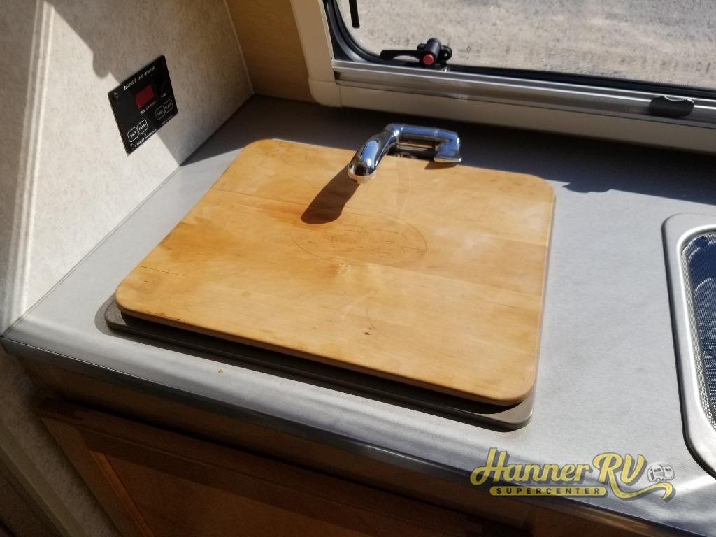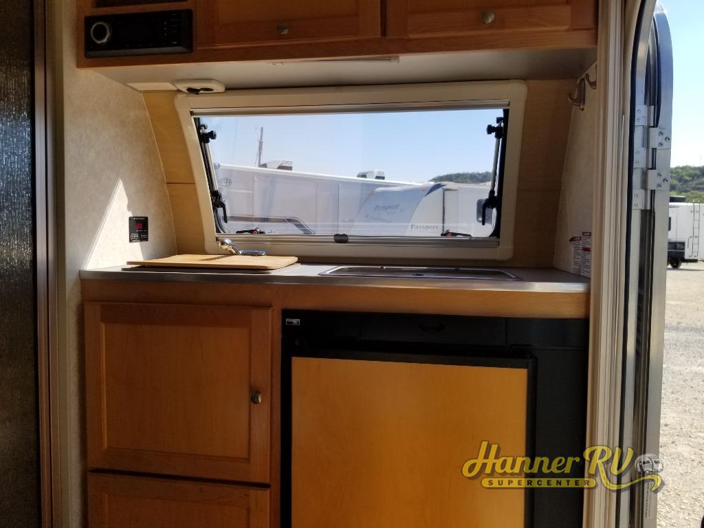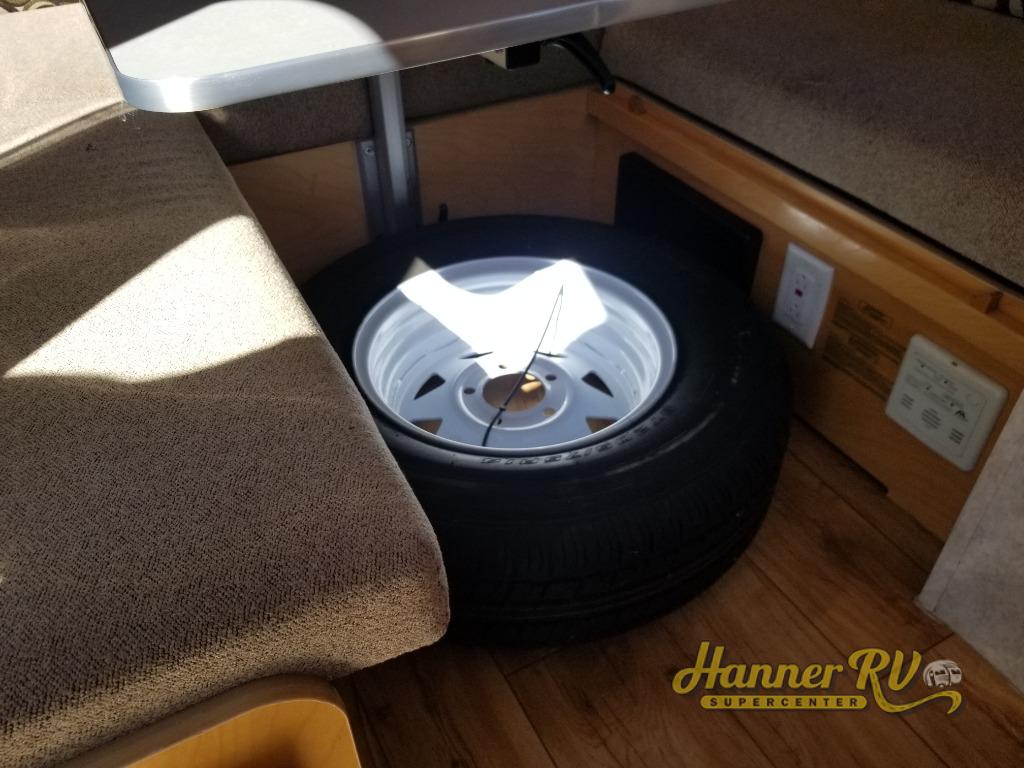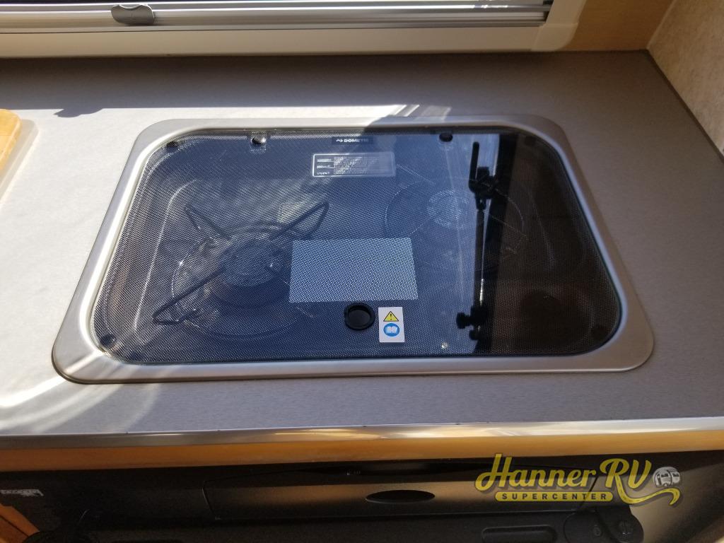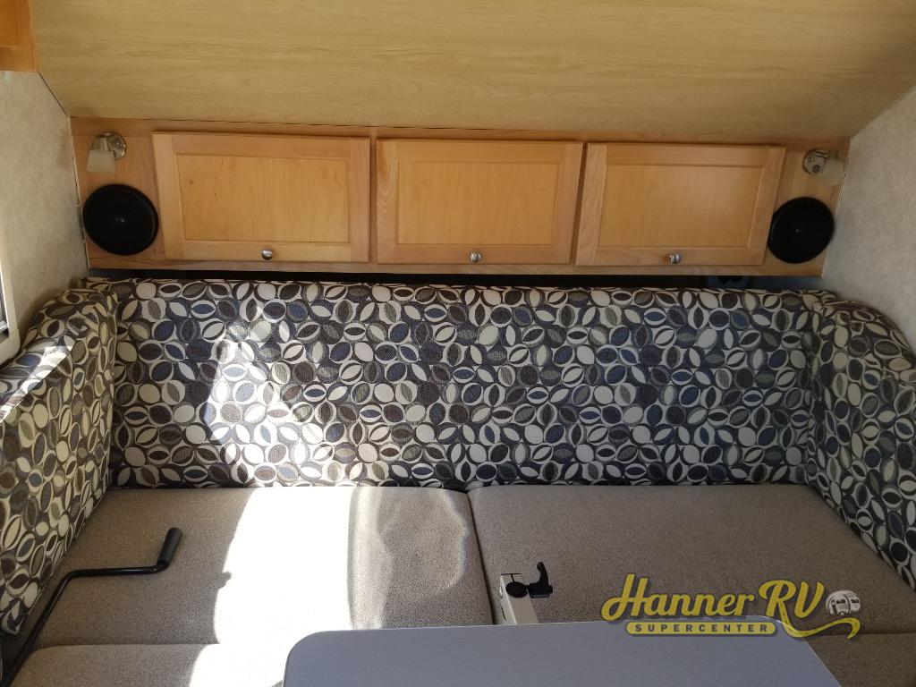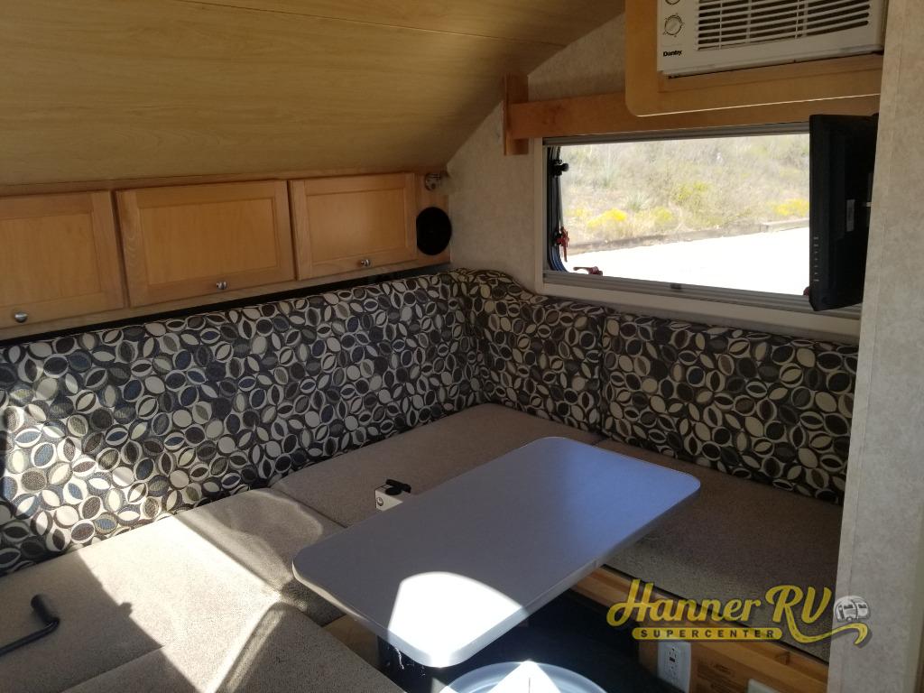 The compact size makes it easy to tow. The kitchenette is equipped with a two-burner stove, sink, and refrigerator. The dinette area easily converts into a comfortable bed.