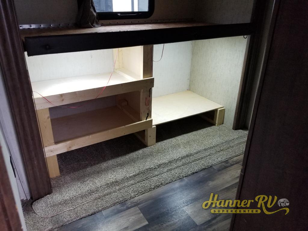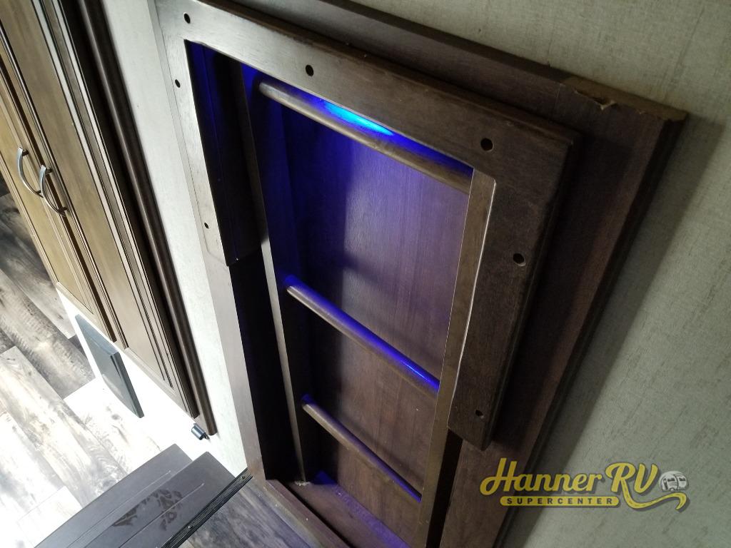 This unique middle bunkhouse includes a glide sofa with a bunk above, plus storage, and a loft above this room. Your kids or guests will appreciate their own space to hang out as well as sleep. Just imagine having your own private bedroom with a large wardrobe with shelves, and the option of adding a washer and dryer if you like. You can even sit down while taking a shower. The main living and kitchen area is wide open with dual slides, and offers plenty of seating to eat or relax while enjoying a show and the fireplace. The outdoor person in the family will love the exterior kitchen and electric awning, plus MAX XL storage.