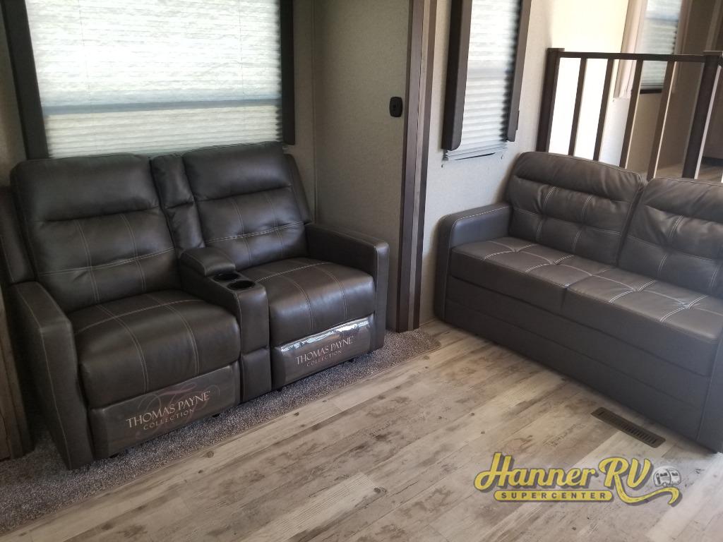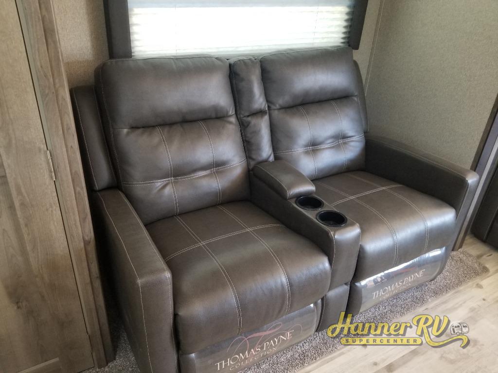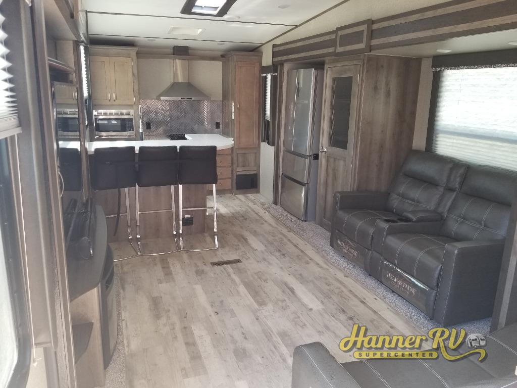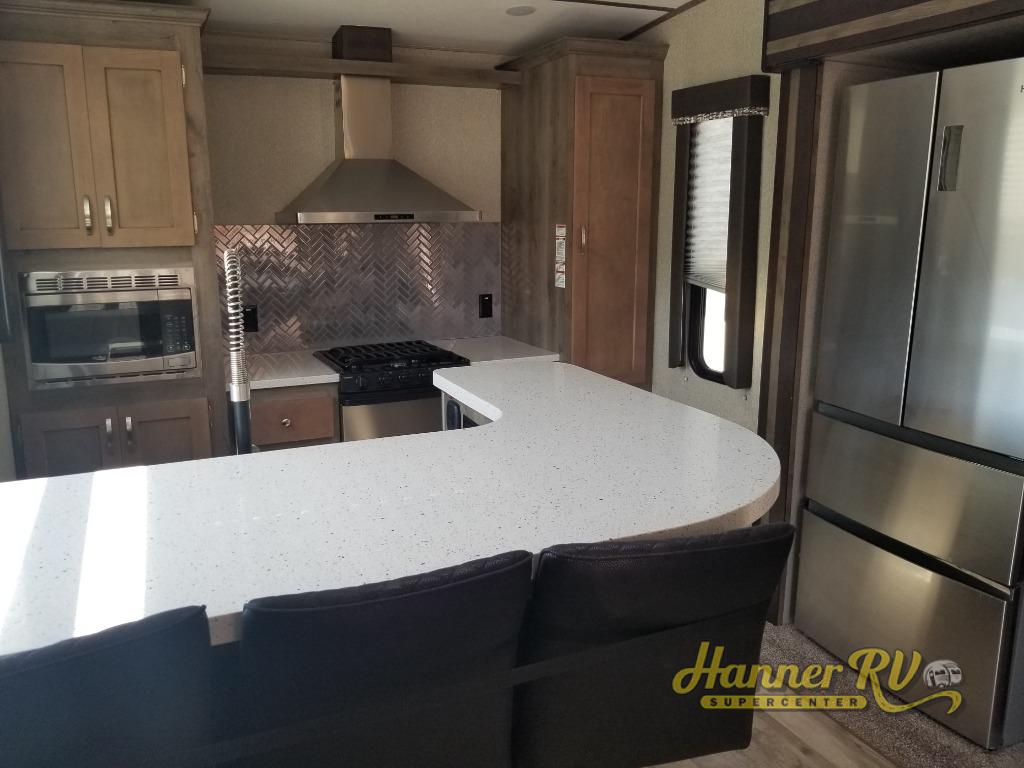 Looking to extend your travels on your next camping trip? This fifth wheel offers a unique rear kitchen with an L-shaped curved counter including three stools, and two refrigerators for all of your cooking and dining needs. There is a 55" HDTV and a fireplace centrally located for everyone in the kitchen and living area to enjoy. You will find four slide outs throughout providing additional floor space for all to move about comfortably. There is also a residential shower with a seat, and the front bedroom includes a closet that has been prepped for a washer and dryer if you choose to add those convenient appliances. Outside, you can cook using the premium outdoor convenience center, and watch TV if you brought yours along. Take a look!