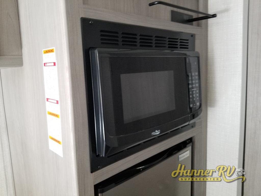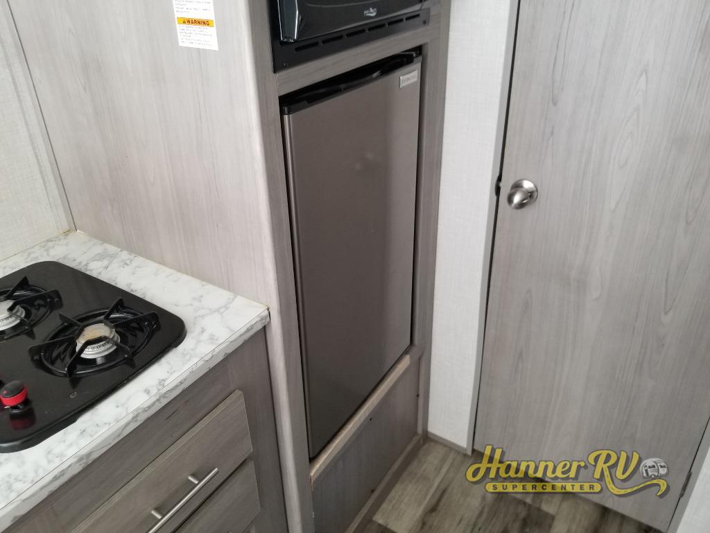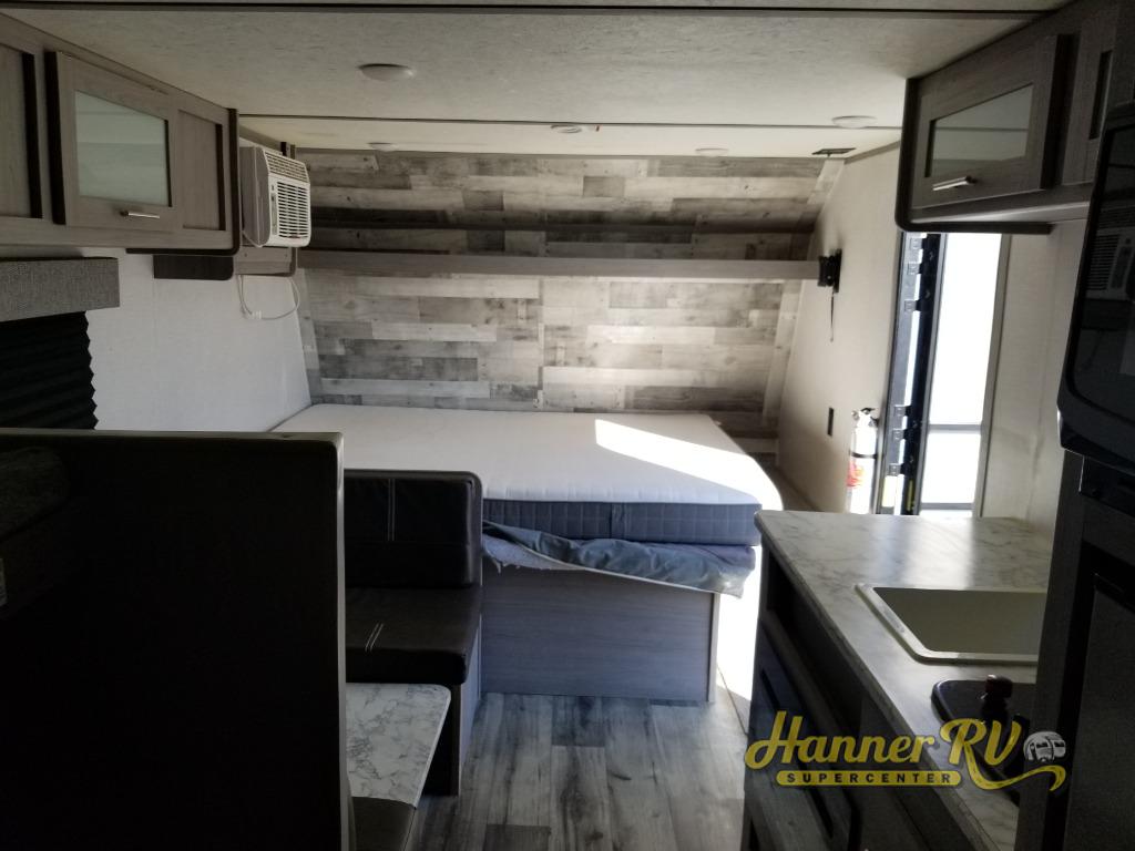 After making dinner on the two burner cooktop or inside the microwave, you can dine at the booth dinette or outside under the 8' power awning if you brought along your camping chairs. Either way you will be comfortable and the dinette may even sleep one person if needed. After playing outdoors all day, everyone can return to get cleaned up in the private toilet and shower room then fall asleep on the queen bed up front or the bunk beds in the rear. And everyone can wake up the next morning to do it over again.