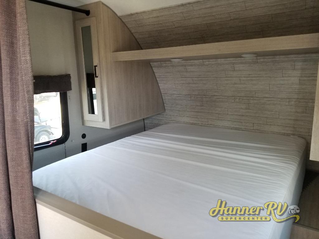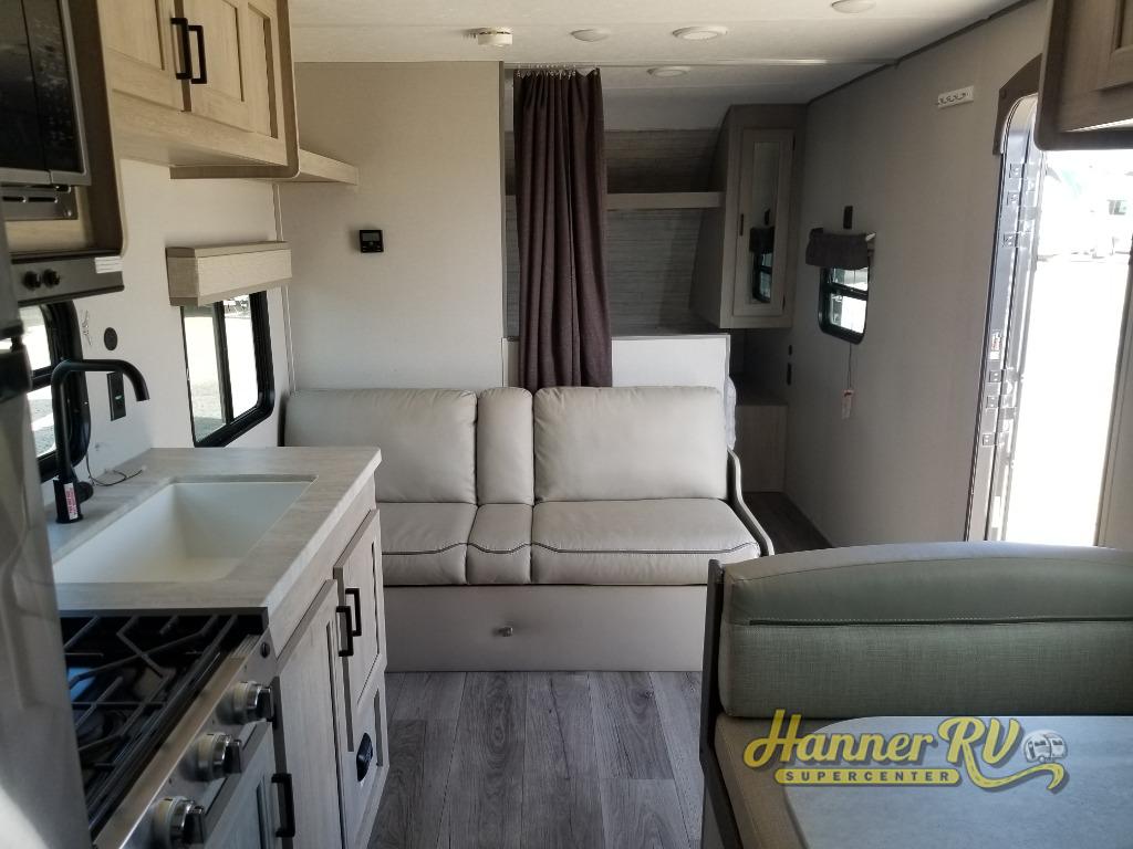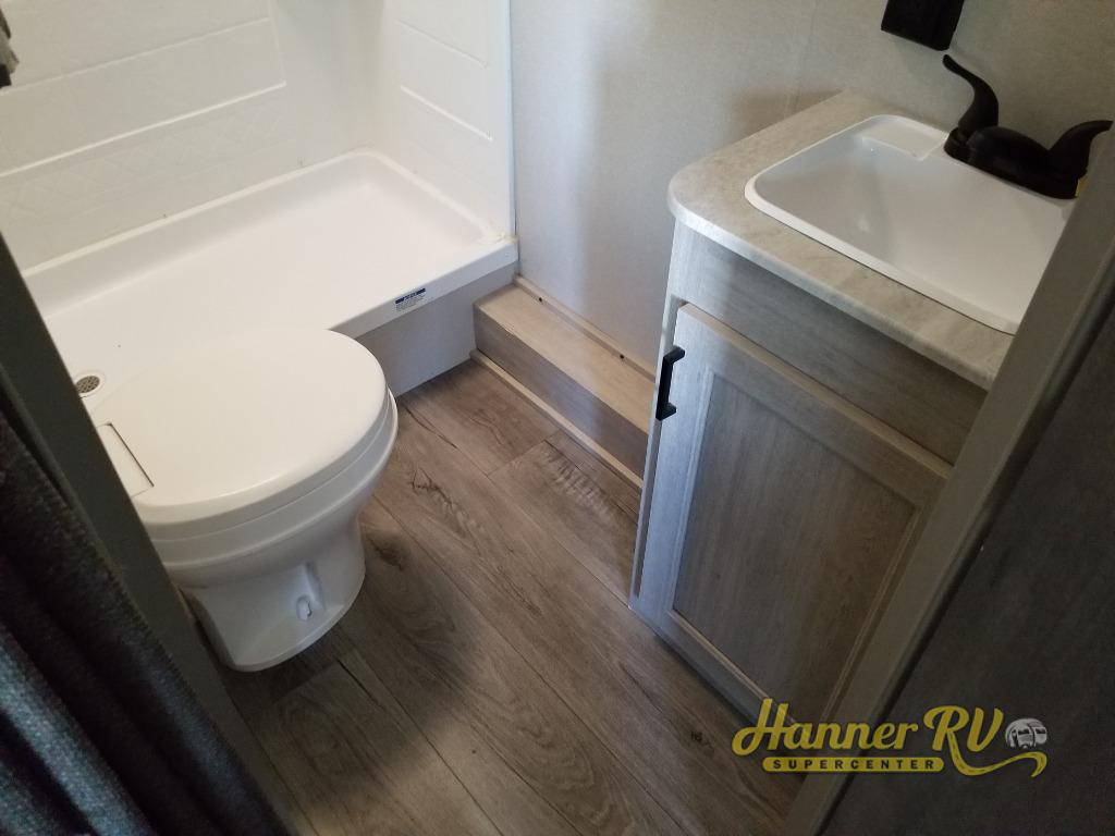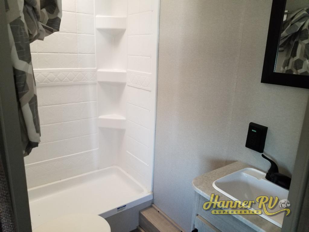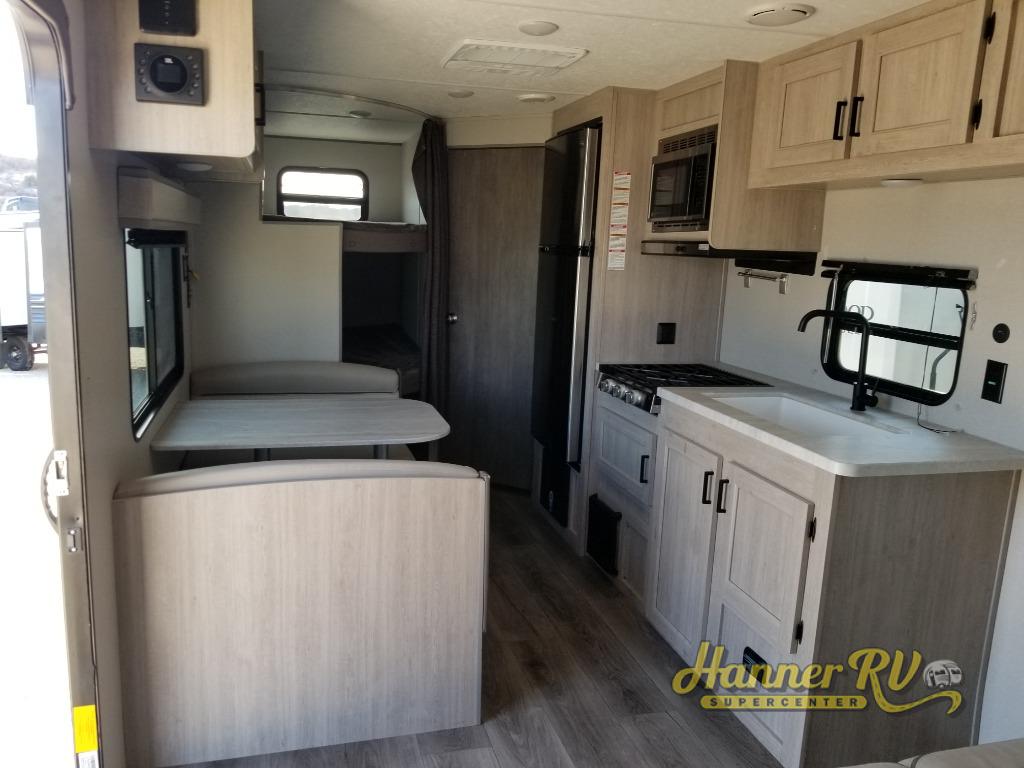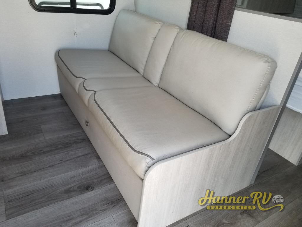 You get to choose to sit at the sofa or at the booth dinette when you are relaxing inside. There is a shelf with storage totes above the sofa for your belongings, and an additional overhead cabinet above the dinette for games. Maybe you want to rest on your own queen bed in the front semi-private bedroom before you make a meal in the kitchen or take a hike through the trails around the lake. The 15' electric awning with multi-color LED lights and a remote offers an outdoor living area where you can visit with other RVers. The kids will love their own double-size bunks that they can share with a friend or two, and the full bathroom is nearby as an added convenience.