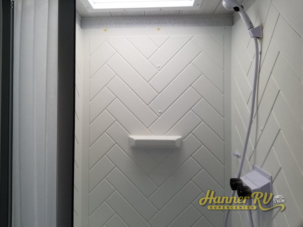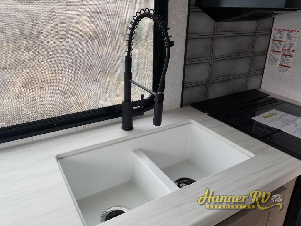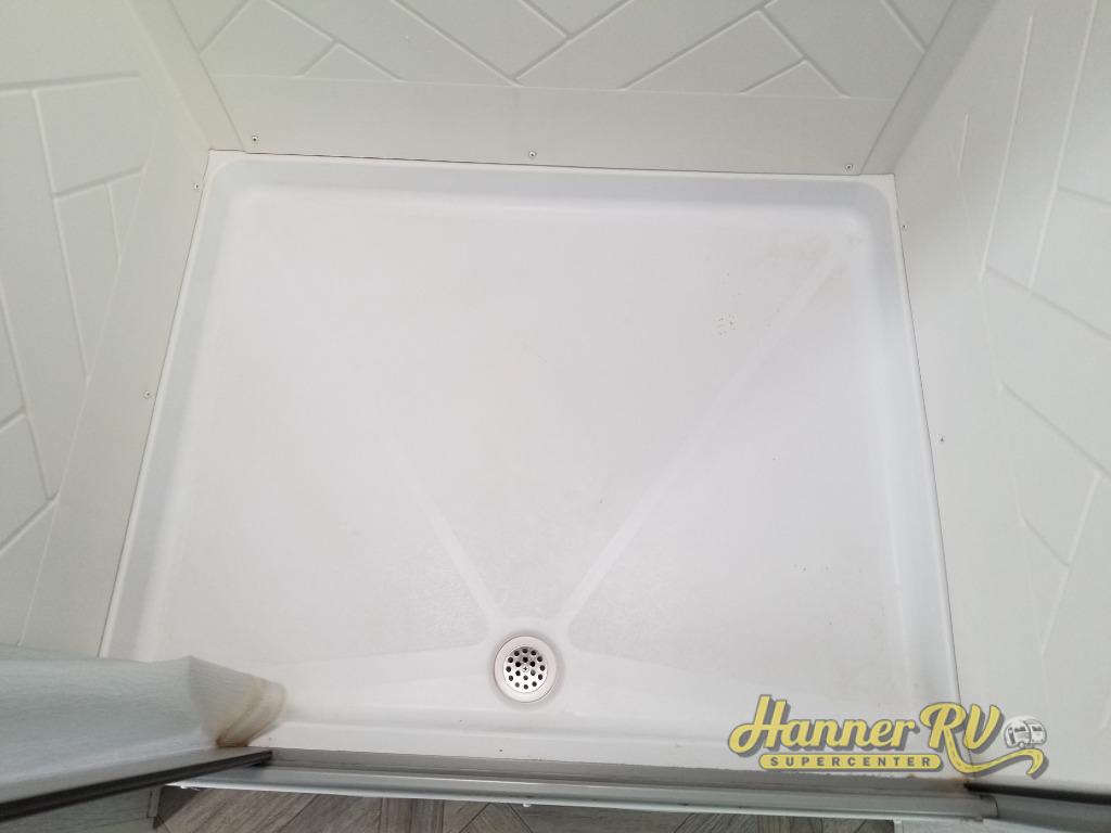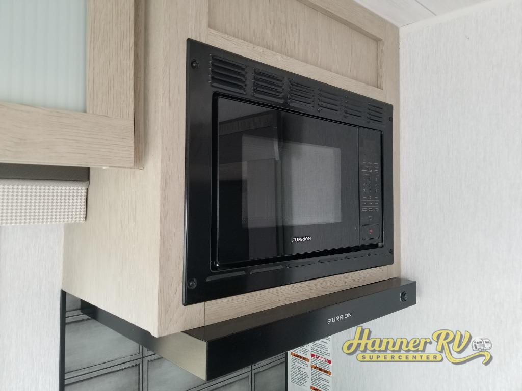 You're going to love cooking in the rear kitchen of this travel trailer! It has everything you need to prepare delicious home cooked meals including a large pantry and oversized fridge, plus there are two bar stools to sit on while you enjoy them. The theater seating is conveniently across from the swiveling entertainment center which has hidden shelves behind it for your games and movies. As you walk-through the bathroom, you will notice a walk-in shower to the left and a toilet and sink to the right. It leads directly into the front private bedroom which has a Versa-Tilt custom king bed to lay your head on at night and wardrobes/nightstands on either side for your items!