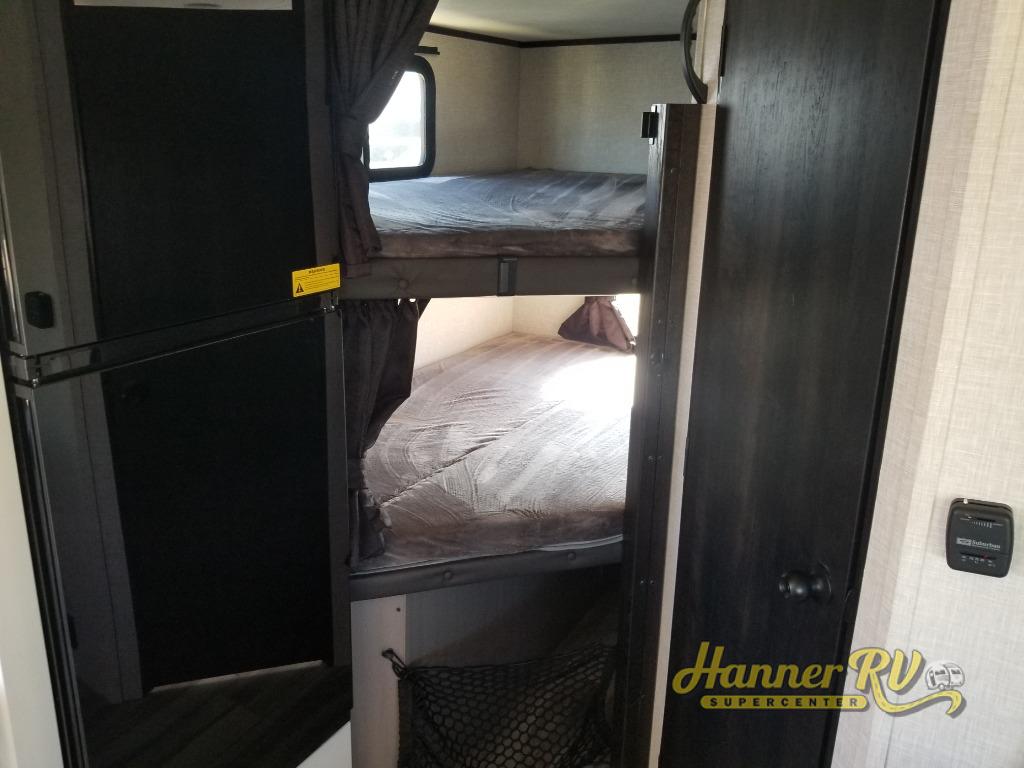 Pack up the family and head to your local state park in this cozy travel trailer for eight. The little ones will love the double-size bunks, and the full bath is close by for convenience. There is a Murphy bed up front that you can fold up each morning to relax on the sofa. If you have any other guests, they can sleep on the U-shaped dinette within the slide out. This model includes a three burner cooktop and a microwave oven, plus an outside kitchen to give the chef a choice where to cook. The 15' power awning will provide shade while the meal is being made, and there is exterior storage for your camp chairs.
