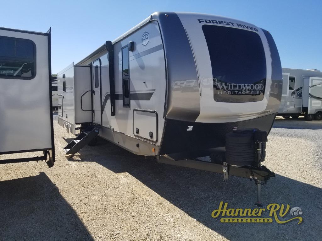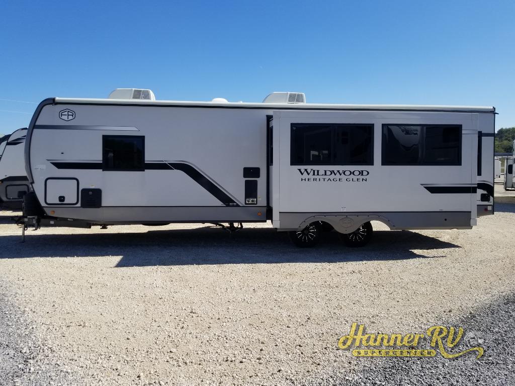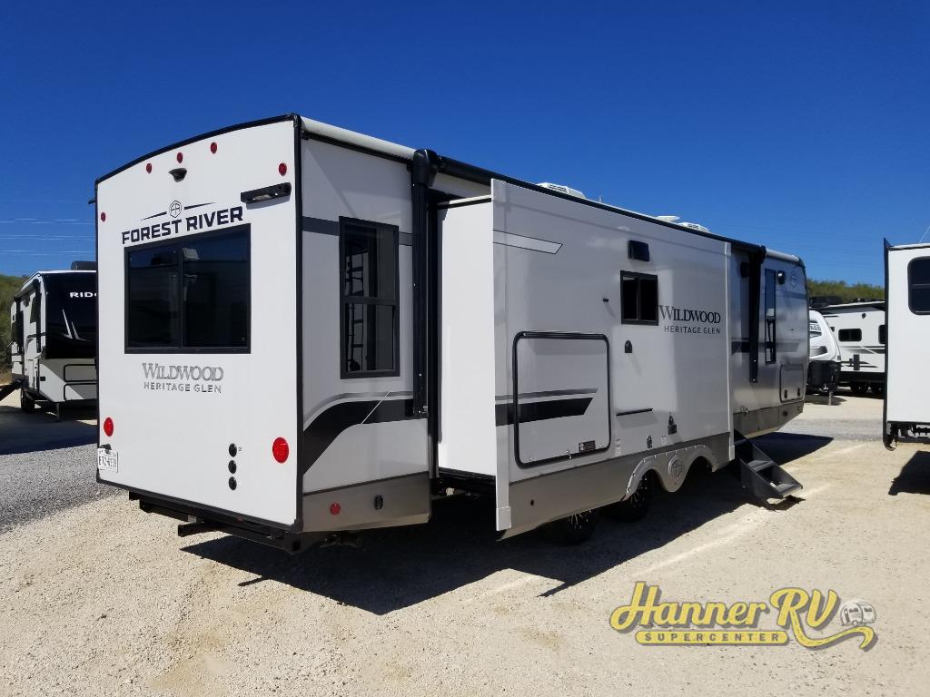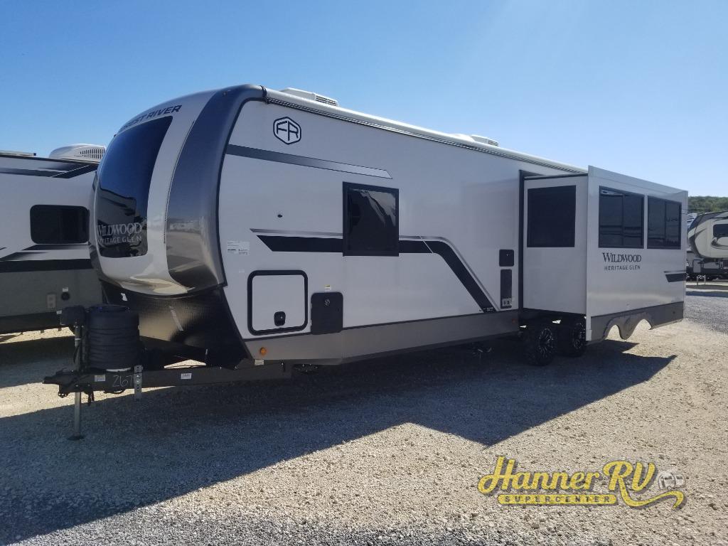 With any Wildwood Heritage Glen travel trailer by Forest River, the quality construction, attention to detail and design along with a bright and welcoming interior allows you to relax in comfort with conveniences while exploring outdoors. Each model includes a WeatherShield one piece fiberglass roof, Maxxis radial tires, and an enclosed underbelly with 12V tank heaters on all holding tanks for added protection. You will appreciate the on-demand tankless water heater, along with the 15K BTU Quite Cool A/C and 50 Amp service with a brace for a second A/C. There is an outside shower with hot and cold water, solar prep, a power tongue jack, plus many more exterior conveniences. Head inside to enjoy matte gold hardware, wood door casings in place of plastic door casings, and full length barreled ceilings for additional head room.