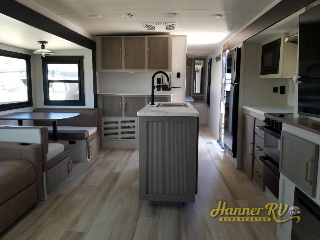 It's time to head to your destination with this Wildwood Heritage Glen travel trailer, whether it be a state park, RV resort, or your own land. Once you arrive, you can easily open up the dual opposing slides for more interior space and start planning your day. You might like to cook a meal, wash dishes using the kitchen island, and dine at the booth dinette, or you can choose the free-standing table option instead. Your guests may choose to relax in the theatre seats or the tri-fold sofa while watching TV, and the outside kitchen/bar will surely be a useful area when wanting to be outside. Don't worry about storage because the extra large pass-through compartment is available for your camping chairs, tables, fishing rods, and such.