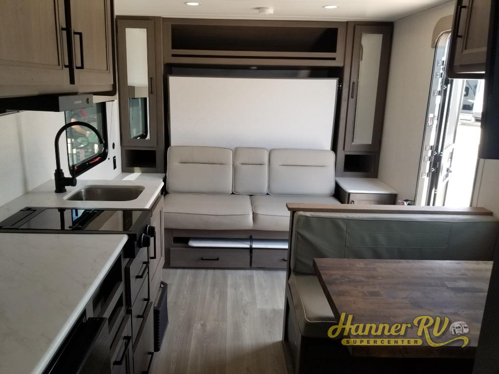 This is the perfect couple's trailer with versatile seating and sleeping space! You'll find a queen-size Murphy bed up front with storage space beside and above plus a full rear bath for added privacy. Once you've made lunch in the full kitchen, you can dine at the booth dinette, or take your plate outdoors to sit under the 10' power awning. You'll also find an unobstructed pass-thru storage outside that will be perfect for fishing poles, lawn chairs, tools and more!