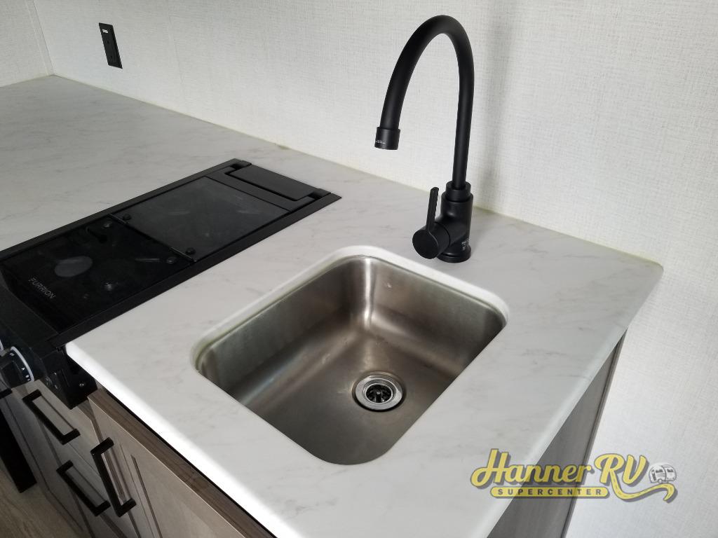 With any Transcend One travel trailer by Grand Design, you will enjoy lightweight towing thanks to their single-axle. There are many interior comforts to make camping easier than ever, such as recessed lighting, residential countertops, and a 6' 6" interior height. Each model is constructed with a heated and enclosed underbelly with suspended tanks, a moisture barrier floor enclosure, and Thermofoil over the roof and front cap for added protection. And a JBL sound system will let you listen to tunes as you visit under the power awning with a Fusion light!