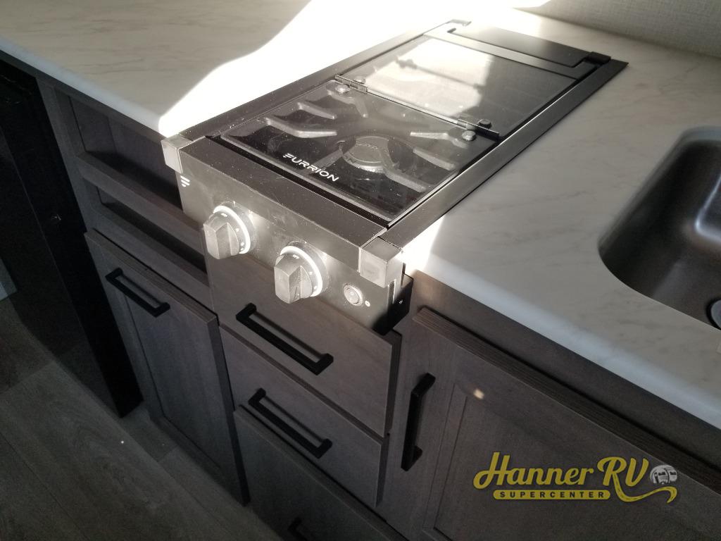 With any Transcend One travel trailer by Grand Design, you will enjoy lightweight towing thanks to their single-axle. There are many interior comforts to make camping easier than ever, such as recessed lighting, residential countertops, and a 6' 6" interior height. Each model is constructed with a heated and enclosed underbelly with suspended tanks, a moisture barrier floor enclosure, and Thermofoil over the roof and front cap for added protection. And a JBL sound system will let you listen to tunes as you visit under the power awning with a Fusion light!