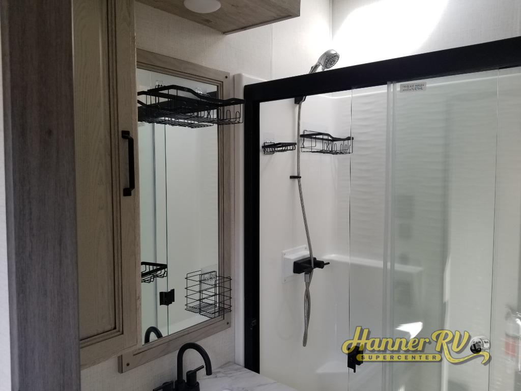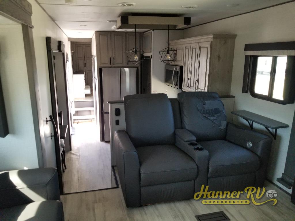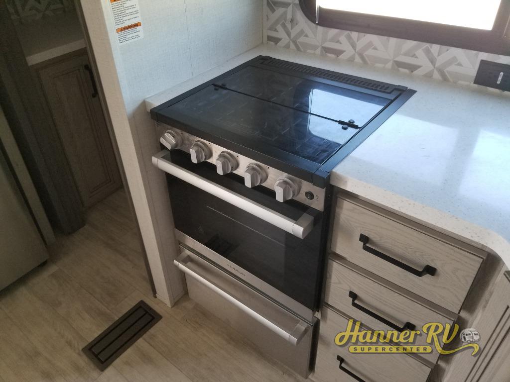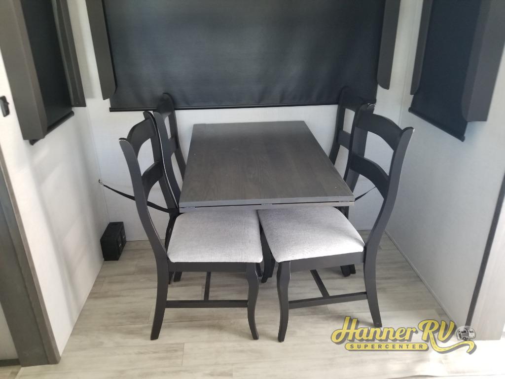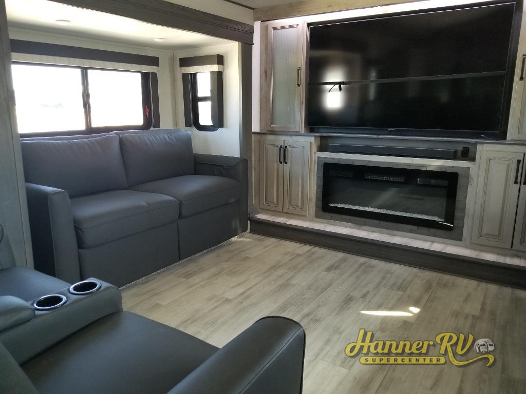 Enjoy traveling with your family and friends in this fifth wheel featuring quad slides providing space for everyone! The front living area offers two of those slides each with a tri-fold sleeper sofa for family or overnight guests. A full wall entertainment center with 65" Smart HD TV and fireplace, plus a theater seat sets this space up as a great gathering place for all to enjoy. Step down to the spacious kitchen and dining area with free standing table and four chairs, a coffee station, plus a refrigerator and range with residential microwave overhead. At the rear of this amazing coach, you will find a raised private master bedroom featuring a king bed slide with storage beneath for extra blankets and such, plus under the entire bedroom area on the outside you will find colossal storage for all sorts of things! The master bedroom offers a master closet, dresser, and a space prepped for a stackable washer and dryer if you choose to add. This unit also features a convenient bathroom located just inside the main entry allowing easy access from outside.