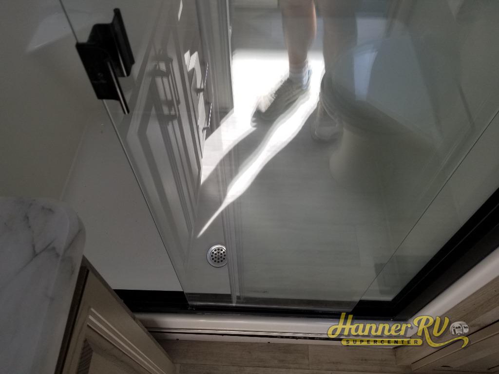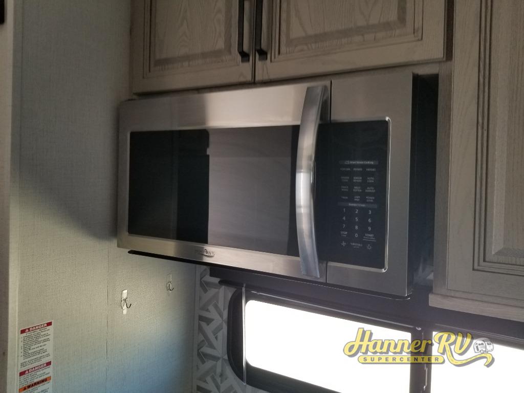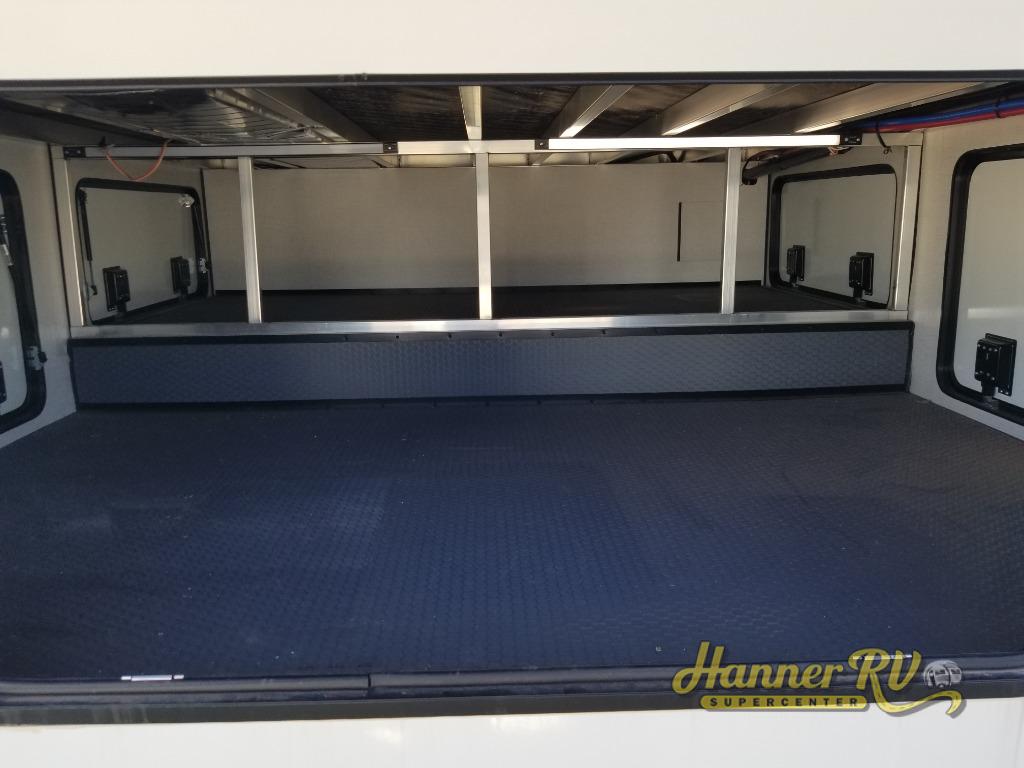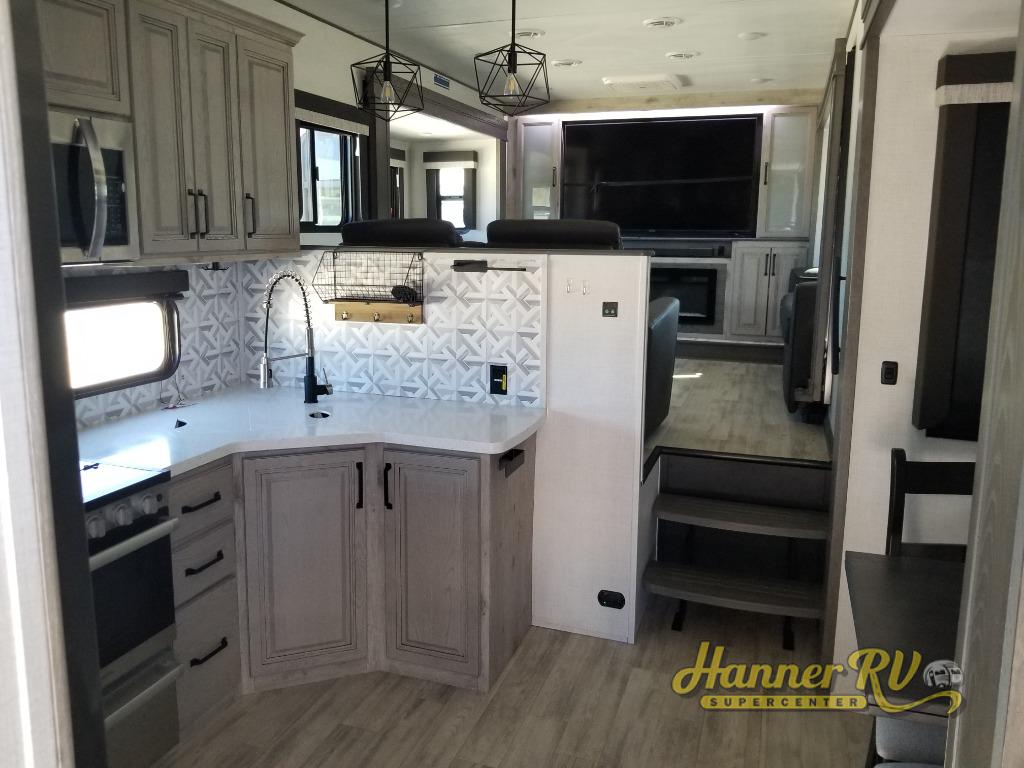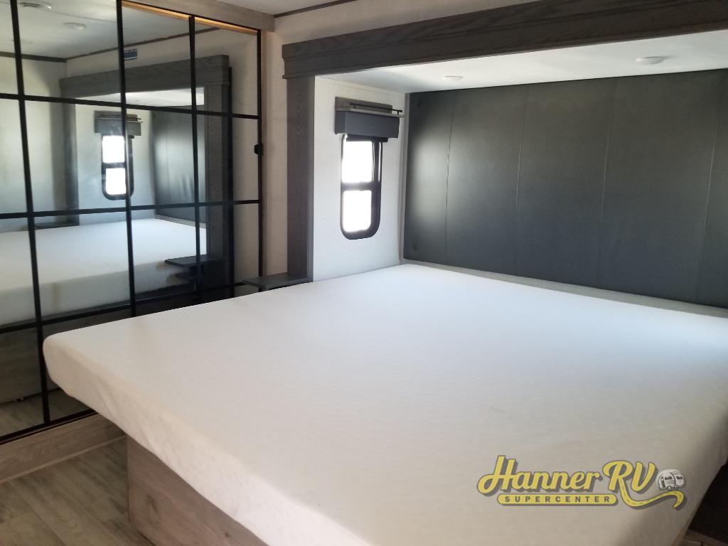 Enjoy traveling with your family and friends in this fifth wheel featuring quad slides providing space for everyone! The front living area offers two of those slides each with a tri-fold sleeper sofa for family or overnight guests. A full wall entertainment center with 65" Smart HD TV and fireplace, plus a theater seat sets this space up as a great gathering place for all to enjoy. Step down to the spacious kitchen and dining area with free standing table and four chairs, a coffee station, plus a refrigerator and range with residential microwave overhead. At the rear of this amazing coach, you will find a raised private master bedroom featuring a king bed slide with storage beneath for extra blankets and such, plus under the entire bedroom area on the outside you will find colossal storage for all sorts of things! The master bedroom offers a master closet, dresser, and a space prepped for a stackable washer and dryer if you choose to add. This unit also features a convenient bathroom located just inside the main entry allowing easy access from outside.